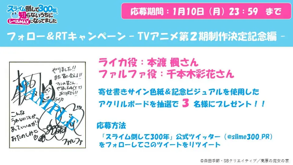 第2期の制作決定を記念して、公式 Twitter(@slime300_PR)にてフォロー&RTによるプレゼントキャンペーンが実施中です。応募要項などは公式Twitterをご確認ください。