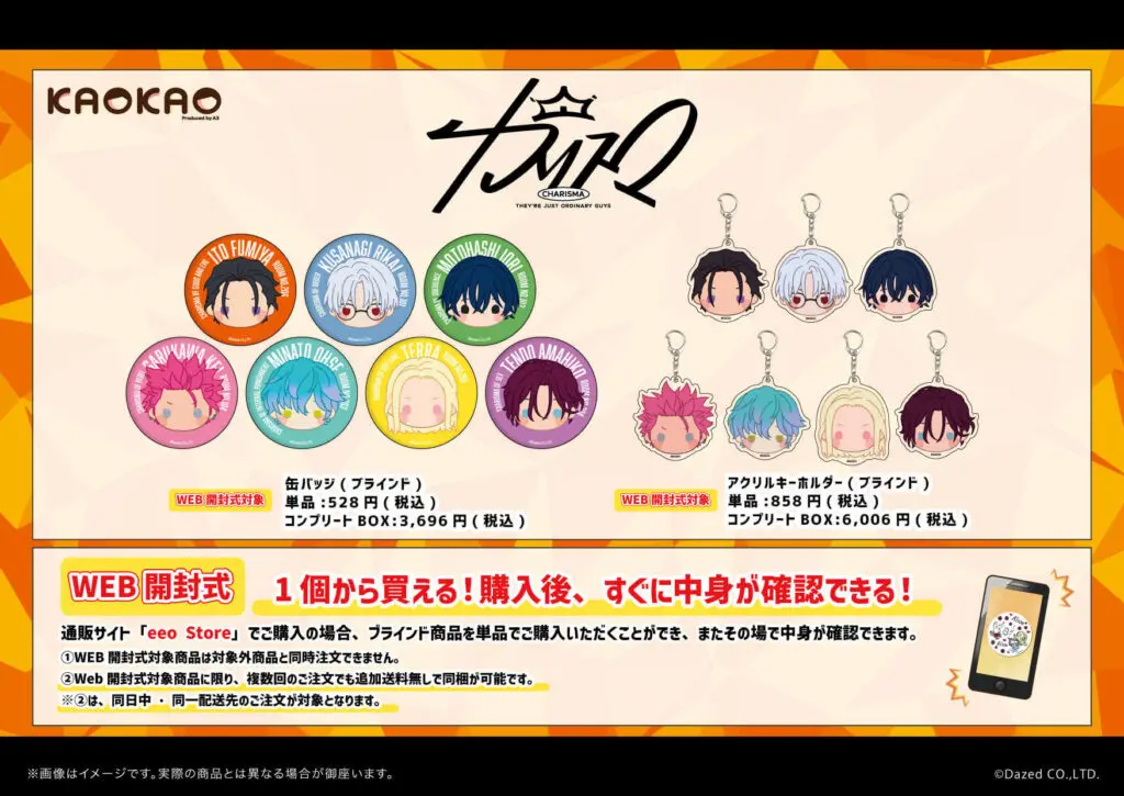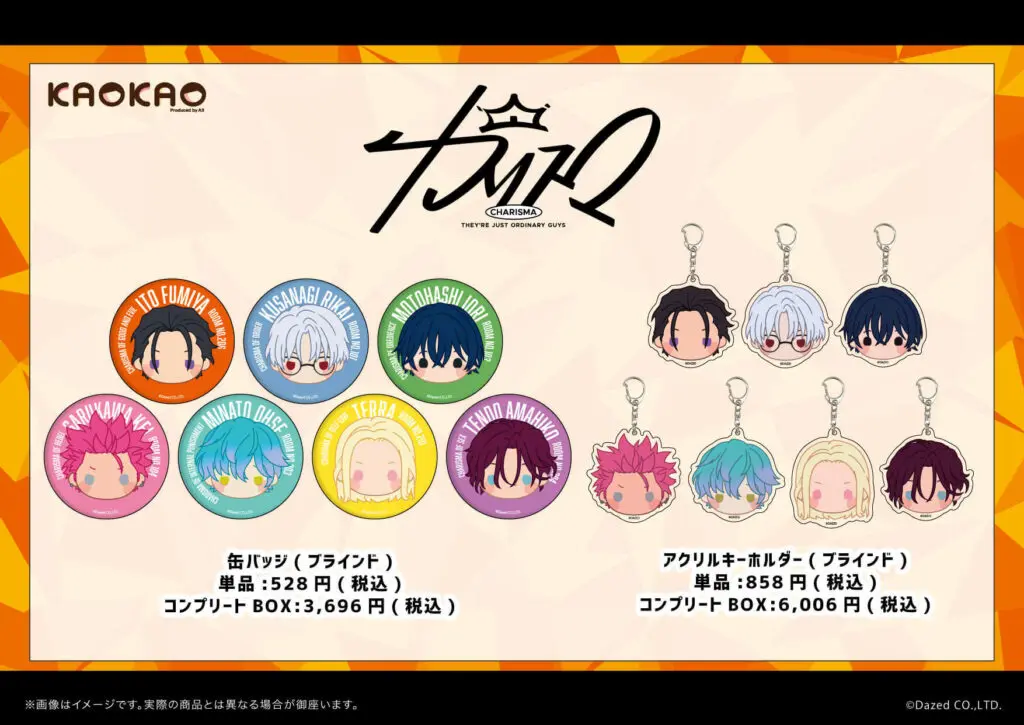 KAOKAOシリーズからは、定番グッズの缶バッジとアクリルキーホルダーが登場!『カリスマ』キャラクター7人のお顔が可愛くデフォルメされています。