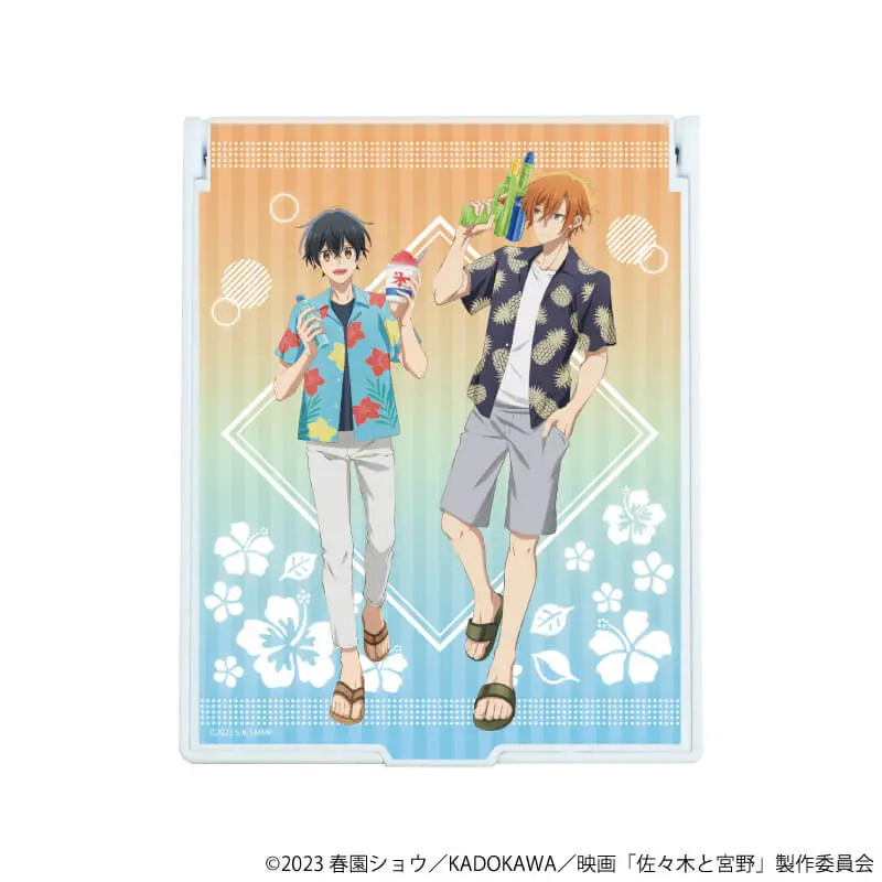 約9×12cmのデカキャラミラーは、お出かけ先の身だしなみチェックに便利なアイテムです。色鮮やかなグラデーションにハイビスカスが描かれた夏らしいデザインが爽やか! カバンから取り出すたびに佐々木&宮野に癒されてください♪