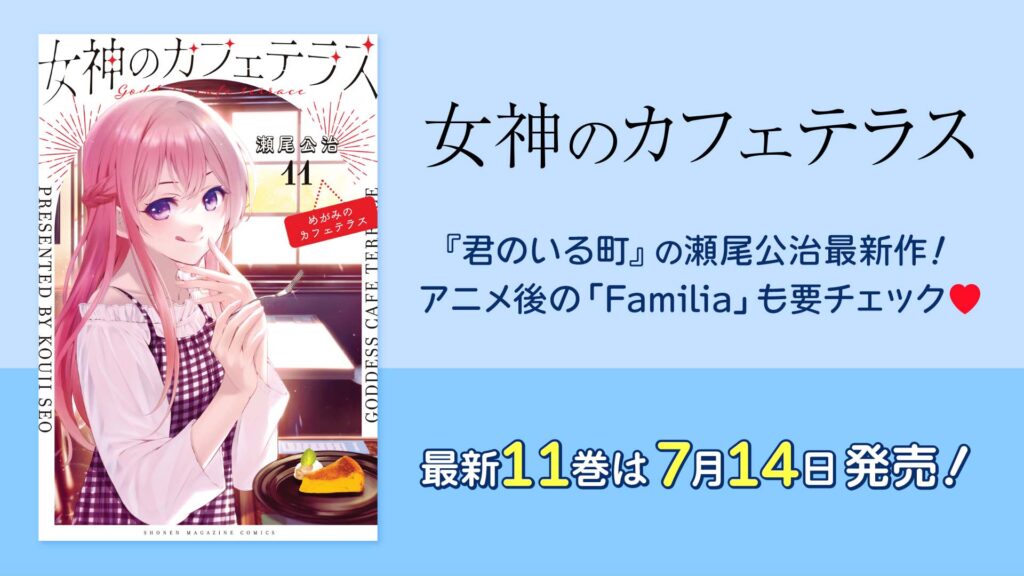 『君のいる町』や『風夏』など数々のヒット作を生み出してきた瀬尾公治先生の最新作『女神のカフェテラス』は、2023年4月よりTVアニメ化、MBS/TBS系列全国28局ネット「スーパーアニメイズム」枠にて先月7月末まで放送されていました。
