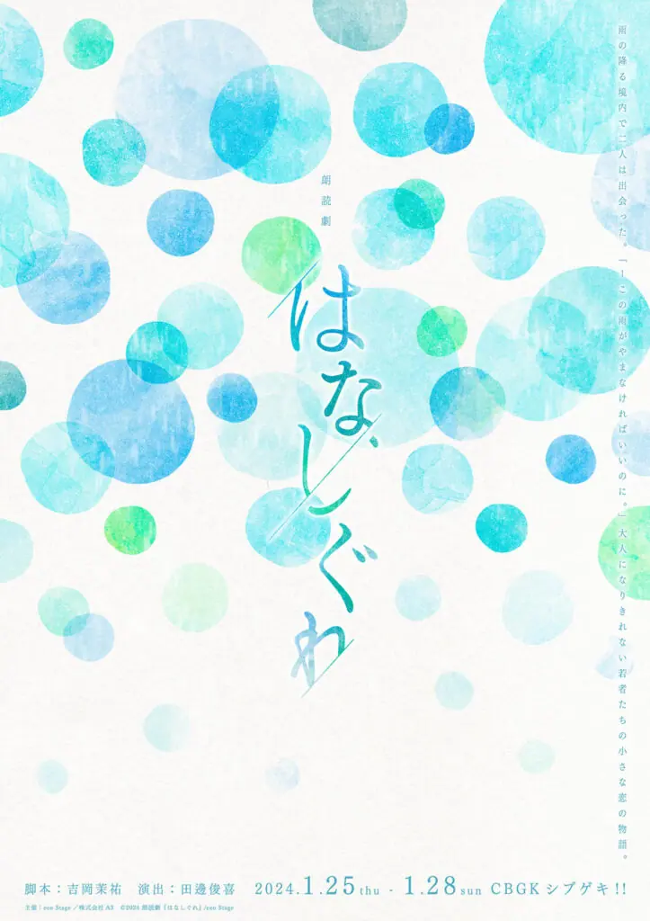 2024年1月25日(木)~1月28日(日)にCBGKシブゲキ!!にて上演されるeeo Stage reading 朗読劇『はなしぐれ』(脚本:吉岡茉祐/演出:田邊俊喜)。