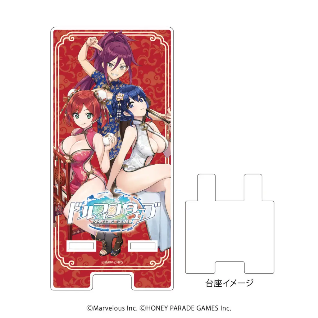 スマキャラスタンドには、煌びやかなチャイナドレスに身を包んだ咲宮入華&都条みちる&暮無夕離の3人をデザイン♪ スマホを立てかけて『ドルフィンウェーブ』を起動させれば、もっともっと楽しくプレイできるはず!