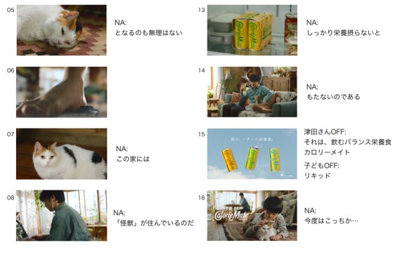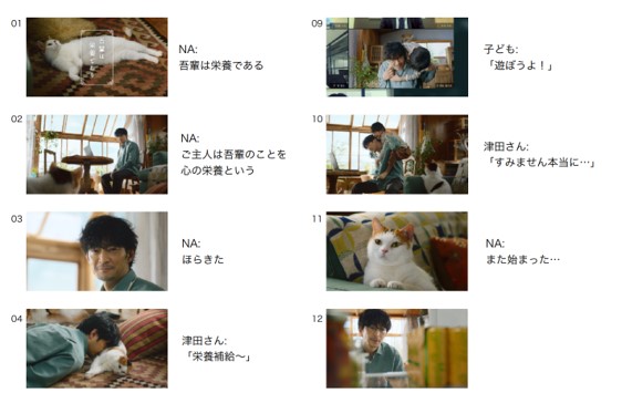 本CMは、主人公とともに暮らす猫の視点で展開。「吾輩は栄養である」と語り始めた猫は、自宅で働く飼い主を眺めています。ふと猫の方を向いた主人公は、「え~よ~ほきゅう~」と一息つきながら、猫とたわむれます。自身を癒そうとする主人公に、猫は「無理もない」となにか理解した様子。猫に癒された後、また打ち合わせに戻っていく主人公。
