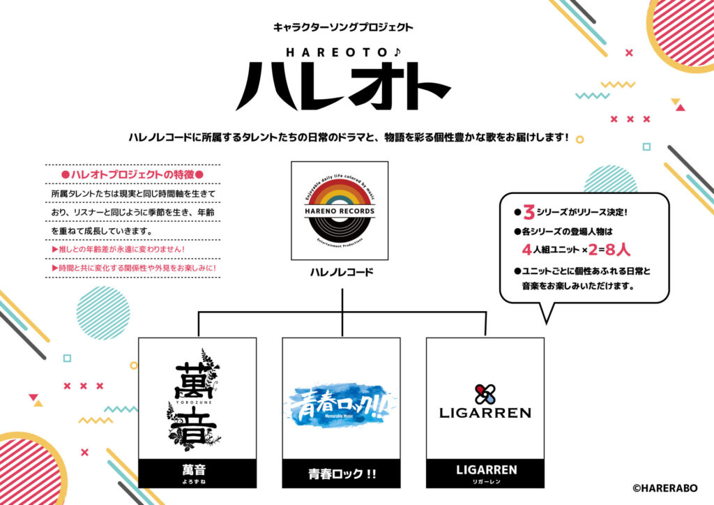 株式会社HARERABOが手掛ける新プロジェクトのひとつ、キャラクターソングプロジェクト『ハレオト』は、架空の芸能プロダクション「ハレノレコード」に所属する個性豊かなアイドル、アーティストたちの日常ドラマと音楽を提供するキャラクターソングプロジェクト。