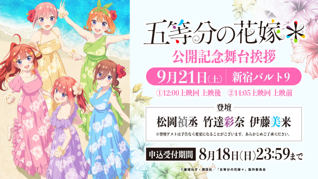 「五等分の花嫁シリーズ」の新作、TVスペシャルアニメ『五等分の花嫁*』。9月20日(金)からの劇場先行上映を記念して、出演キャスト登壇の舞台挨拶と映画『五等分の花嫁』の再上映が決定したことが明らかになりました。