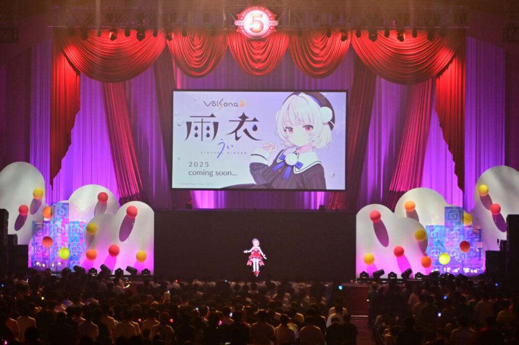 1つ目は、本ライブにてお披露目となった5周年記念新衣装グッズの発売と、個展「雨を手繰る」及び本ライブグッズの事後通販の実施。2つ目には、華やかな映像と共に本ライブの映像商品化が発表され、来場したファンの歓声に包まれました。最後に、臨場感のある映像で「バーチャルシンガー化決定」というテキストと共に、VoiSona「雨衣(うい)」の発売が発表されました。VoiSonaは最新の歌声合成技術を使用した音声創作ソフトウェアで、「雨衣」はしぐれういがキャラクターデザインとキャラクターボイスを担当する新たなバーチャルシンガーボイスライブラリです。本ライブ終了後に「雨衣」のSNSやティザーサイトも公開されました。