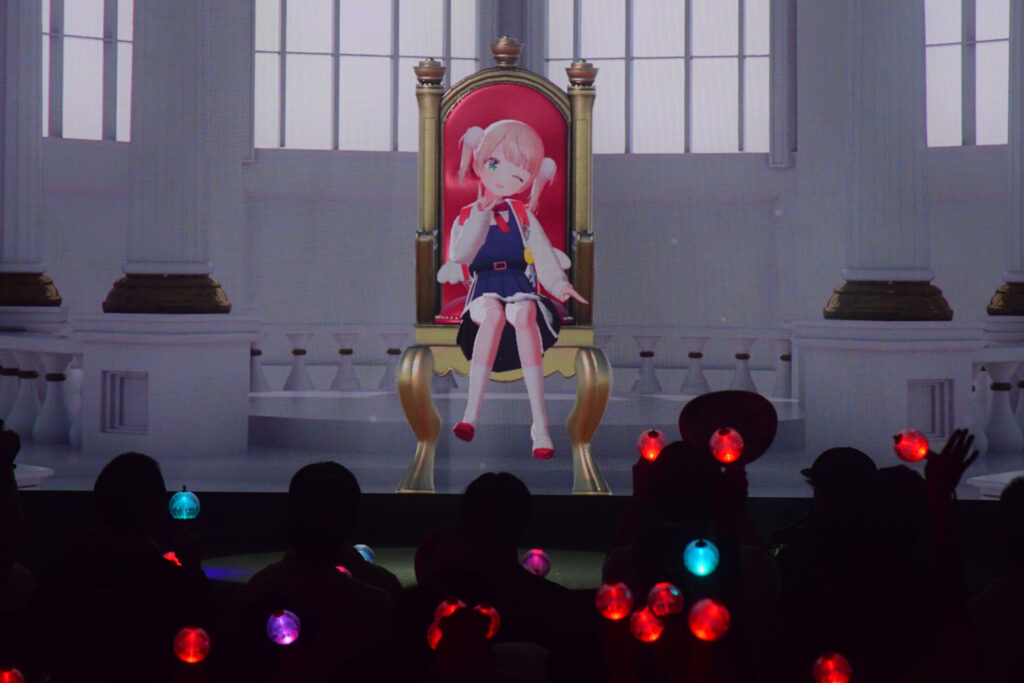 続いて披露されたのはピノキオピー氏の楽曲「神っぽいな」です。しぐれうい(9さい)の小さな姿で大きな玉座に座りながらダンスをする姿が印象的で、可愛い見た目と歌声で披露される少しダークなテイストの楽曲のギャップに、会場は目を奪われていました。