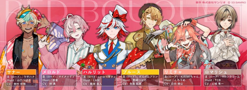 RED BOUQUETのキャストとして、ハローキティのフラガリア・ハルリット役を酒寄楓太さん、マイメロディのフラガリア・メロルド役を安藤夢叶さん、ポムポムプリンのフラガリア・プルース役を井澤勇貴さん、マロンクリームのフラガリア・ロマリシュ役を樫澤優太さん、KIRIMIちゃん.のフラガリア・リミチャ役を大見拓土さん、ウサハナのフラガリア・サナー役を山野光さんが演じます。