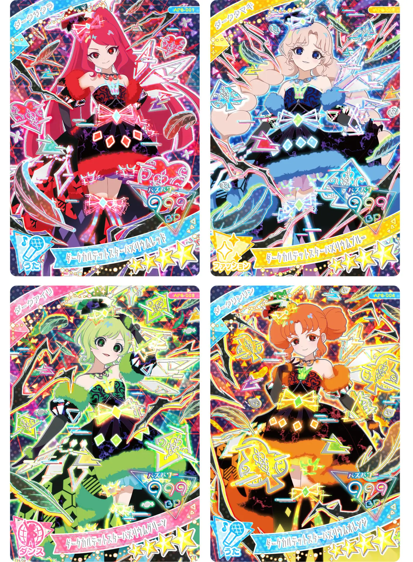 「6だん」ではダークチィのほか、「ダークカルテットスター」の4人(サクラ、タマキ、アイリ、リンリン)のアイプリカードが新たに登場。さらに、ダークチィのカードではアニメにも登場したダークチィが歌う楽曲「GIRA GIRA STAR」、「ダークカルテットスター」のカードでは新曲「ニュースタージョーカー」でプレイすることができるように。
