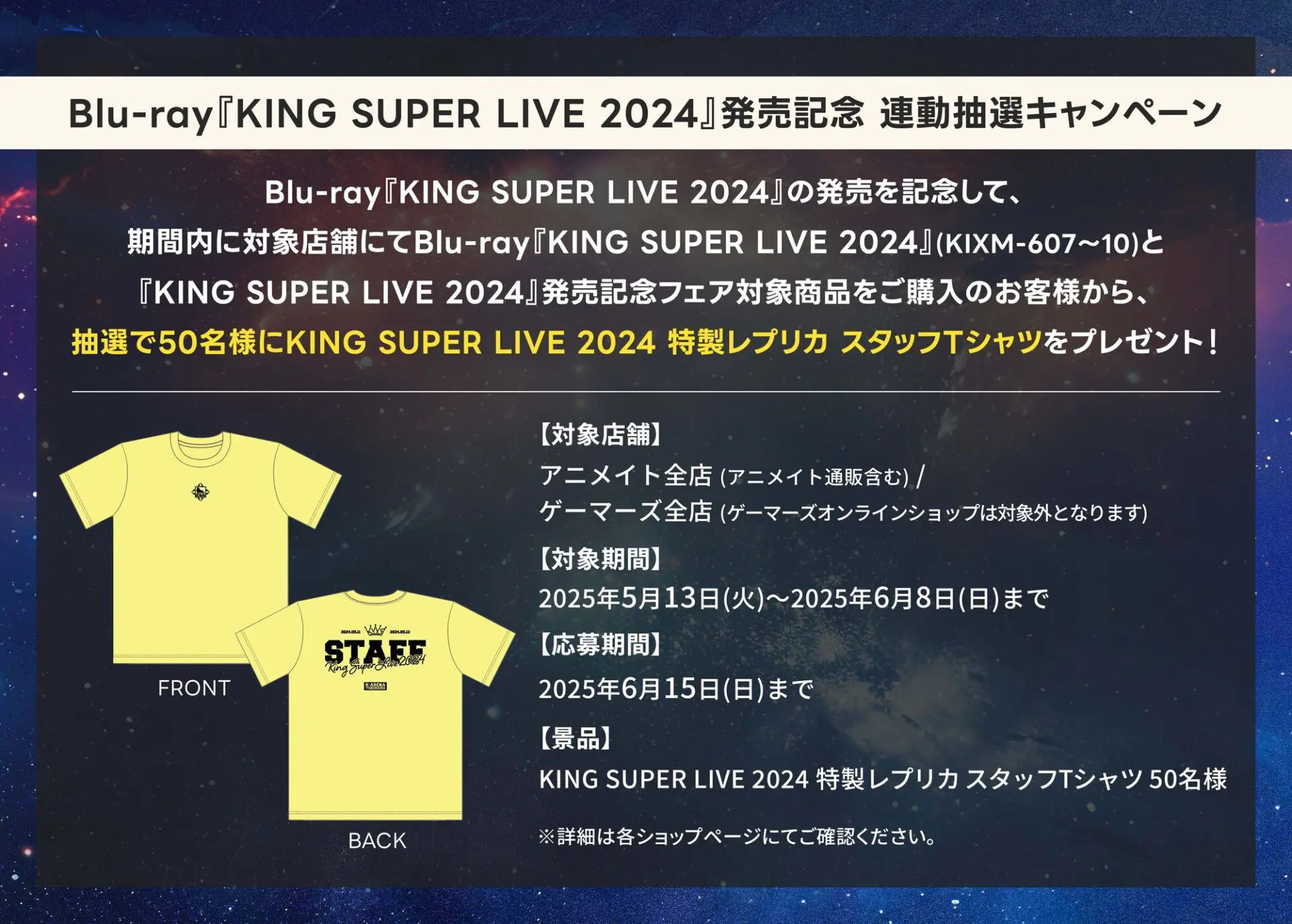 期間内に対象店舗にて、Blu-ray「KING SUPER LIVE 2024」(KIXM-607~10)と「KING SUPER LIVE 2024」発売記念フェア対象商品を購入した方の中から抽選で50名に「KING SUPER LIVE 2024 特製レプリカ スタッフTシャツ」が当たります。