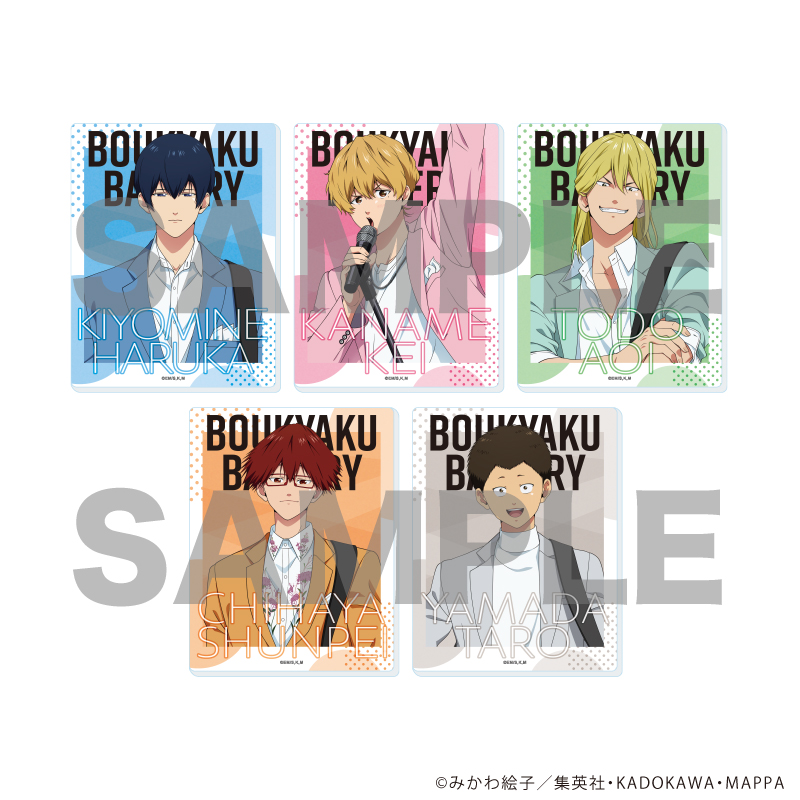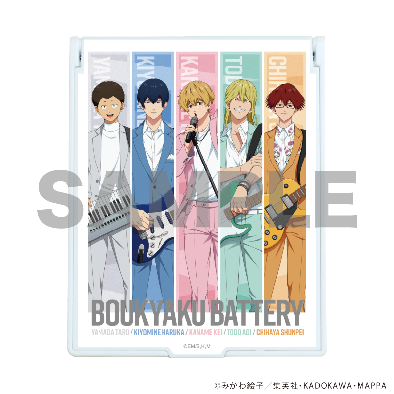 今回の新作グッズに使用している描き下ろしイラストでは、清峰葉流火、要圭、藤堂葵、千早瞬平、山田太郎が自身のイメージカラーのスーツを着用。また、ギターやベースを手にし、今からライブが始まりそうな雰囲気を醸し出しています。