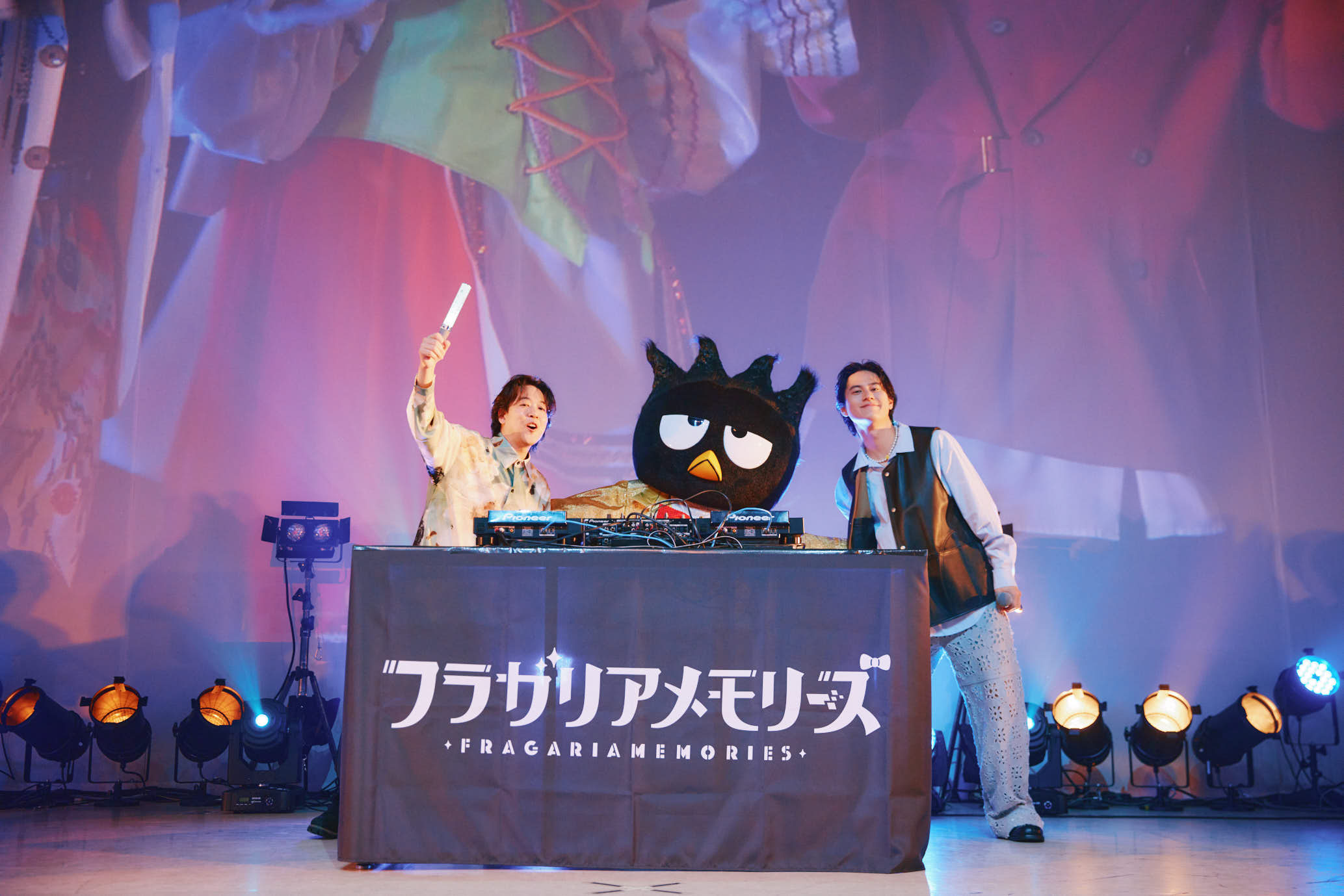 「推し活ピューロランドフェス」にちなみ音楽で会場を盛り上げるべく、クロミが登場しDJプレイを披露しました。ハローキティとあひるのペックルも登場し、「フラガリアメモリーズ」の展開の主軸であるオリジナル楽曲のうち、2023年にリリースされた『青空のメモリー』から2025年3月にリリースされた最新曲『言花サンセット』まで、全9曲をこの日限りのスペシャルメドレー形式でお届け。会場は大盛り上がりで、クロミに仕えるフラガリア「クロード」役の坂田将吾さん、あひるのペックルに仕えるフラガリア「アルペック」役の畠中祐さんは、それぞれが演じるフラガリアの主(ロード)と念願の初対面を果たし、「クロミ様に会えるのを楽しみにしていたので、ドキドキしています!」(坂田さん)、「ようやく会えてうれしいです! かわいすぎる!」(畠中さん)と大興奮の様子でした。