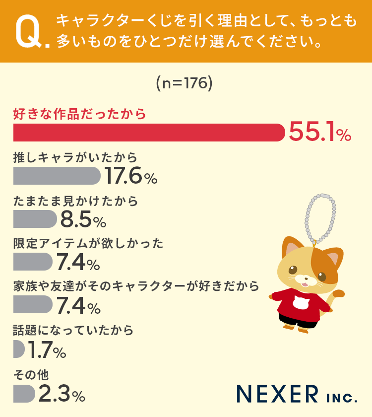 まずはキャラクターくじを引く理由として、もっとも多いものをひとつだけ選んでもらいました。