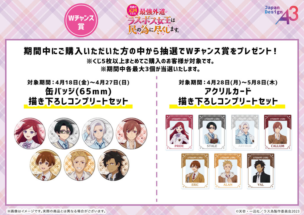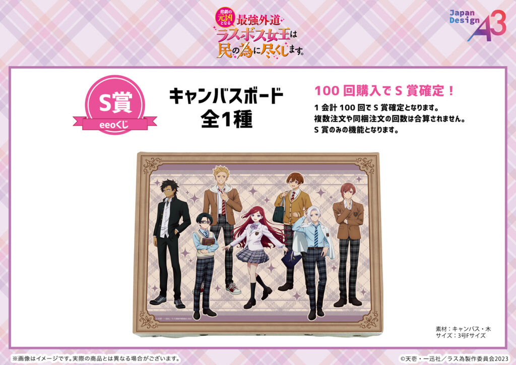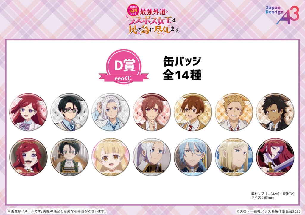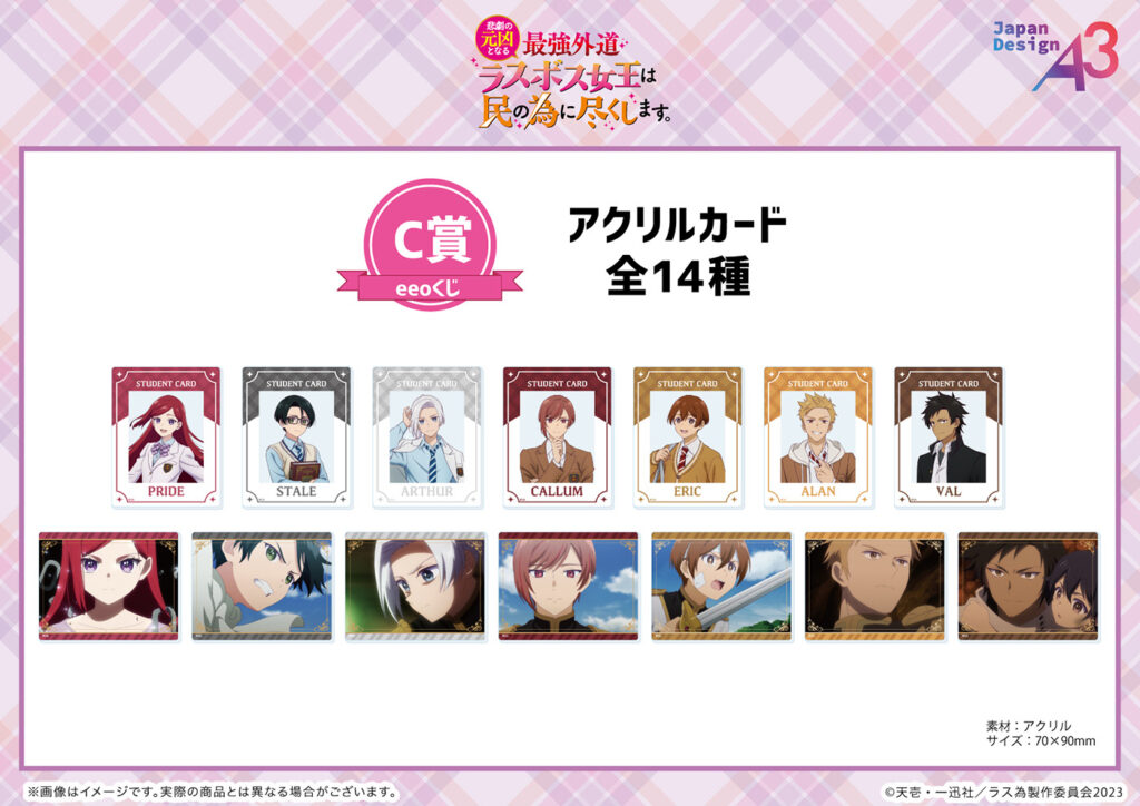 “制服”がテーマの描き下ろしイラストや、アニメの思い出が蘇る場面写を使用したグッズが景品となったTVアニメ『悲劇の元凶となる最強外道ラスボス女王は民の為に尽くします。』の「eeeくじ」。