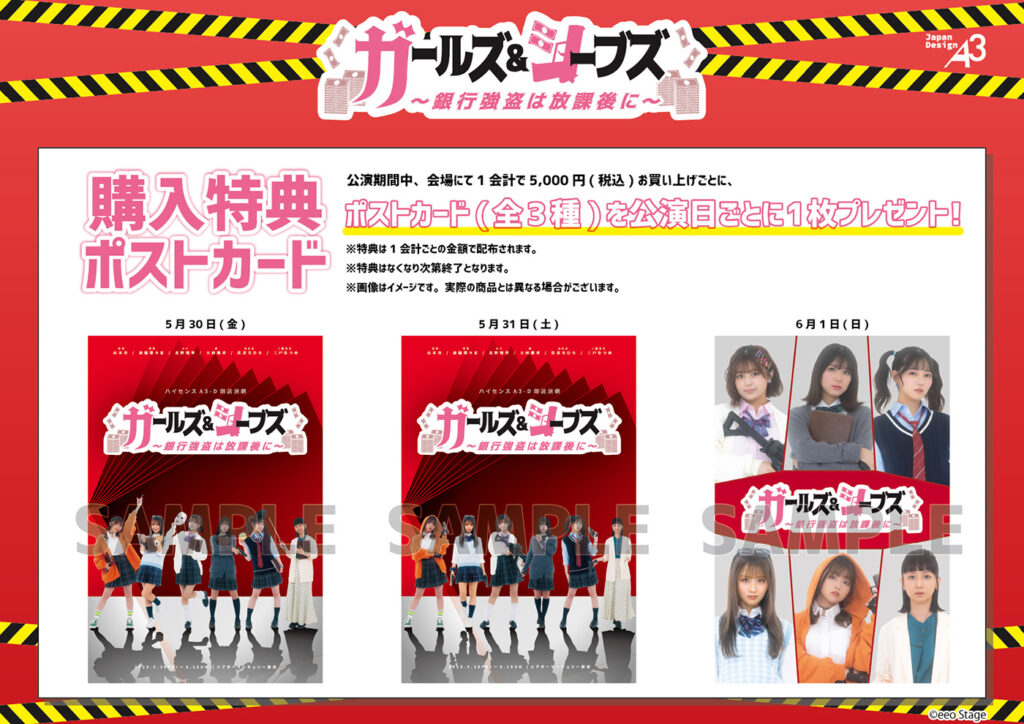 公演期間中、会場にて1会計で5,000円(税込)お買い上げごとに、ポストカード(全3種)を公演日ごとに1枚、プレゼント! ご来場の際は会場でのグッズ購入もお忘れなく!!