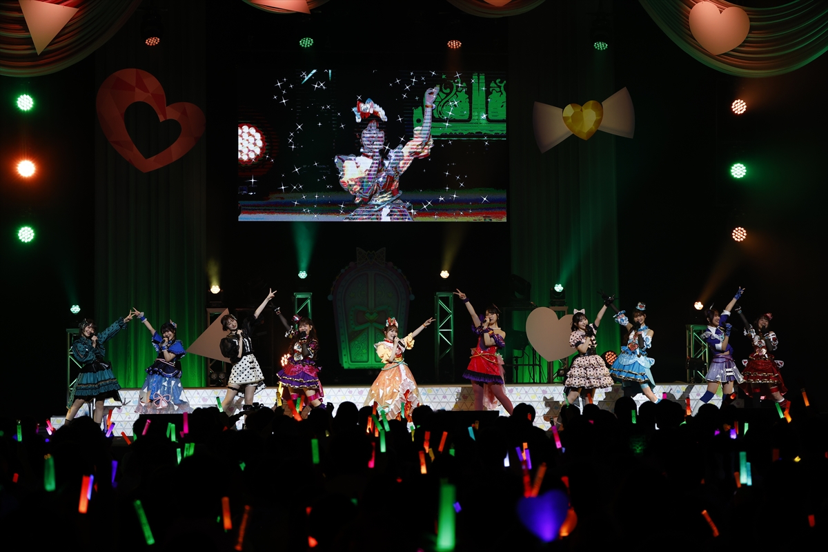 次々とステージ上のスクリーンに映し出されるお知らせに会場から歓声が上がる中、ガァルマゲドンとノンシュガーが加わったところで、和多田さんの「その調子で“答え”を言っていってくださいね!」という合図とともに、10人による「ネバギバラバー」がスタート。