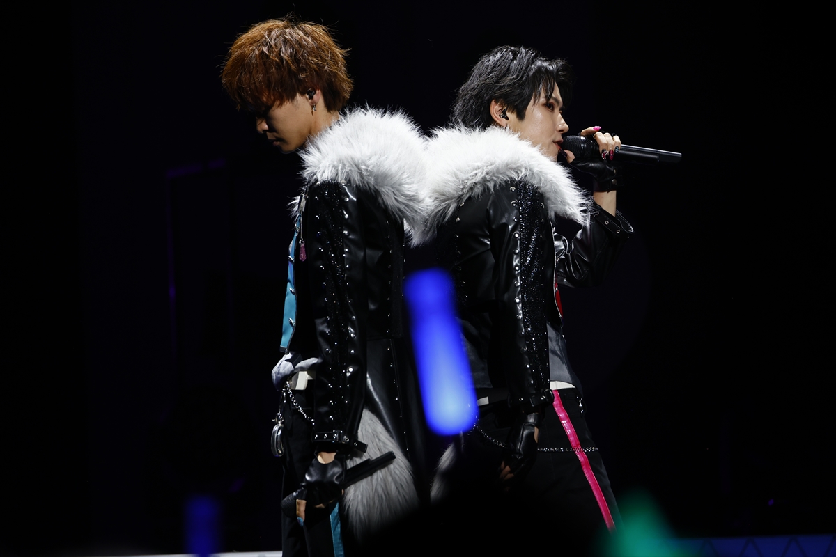 場内が熱気に包まれる中ステージが暗くなり、「どこを見ているでござるか? 後ろがガラ空きでござる」というセリフとともに会場の後方に現れたのは河合健太郎さん(大江戸シンヤ役)、鵜澤正太郎さん(ウシミツ役)たちDARK NIGHTMARE。「お前ら、俺たちとバキろうぜ!」と「We’re never ever」をステージに向かいながら歌うと、突然目の前に現れたDARK NIGHTMAREの2人に、ファンは驚きを隠せない様子でした。