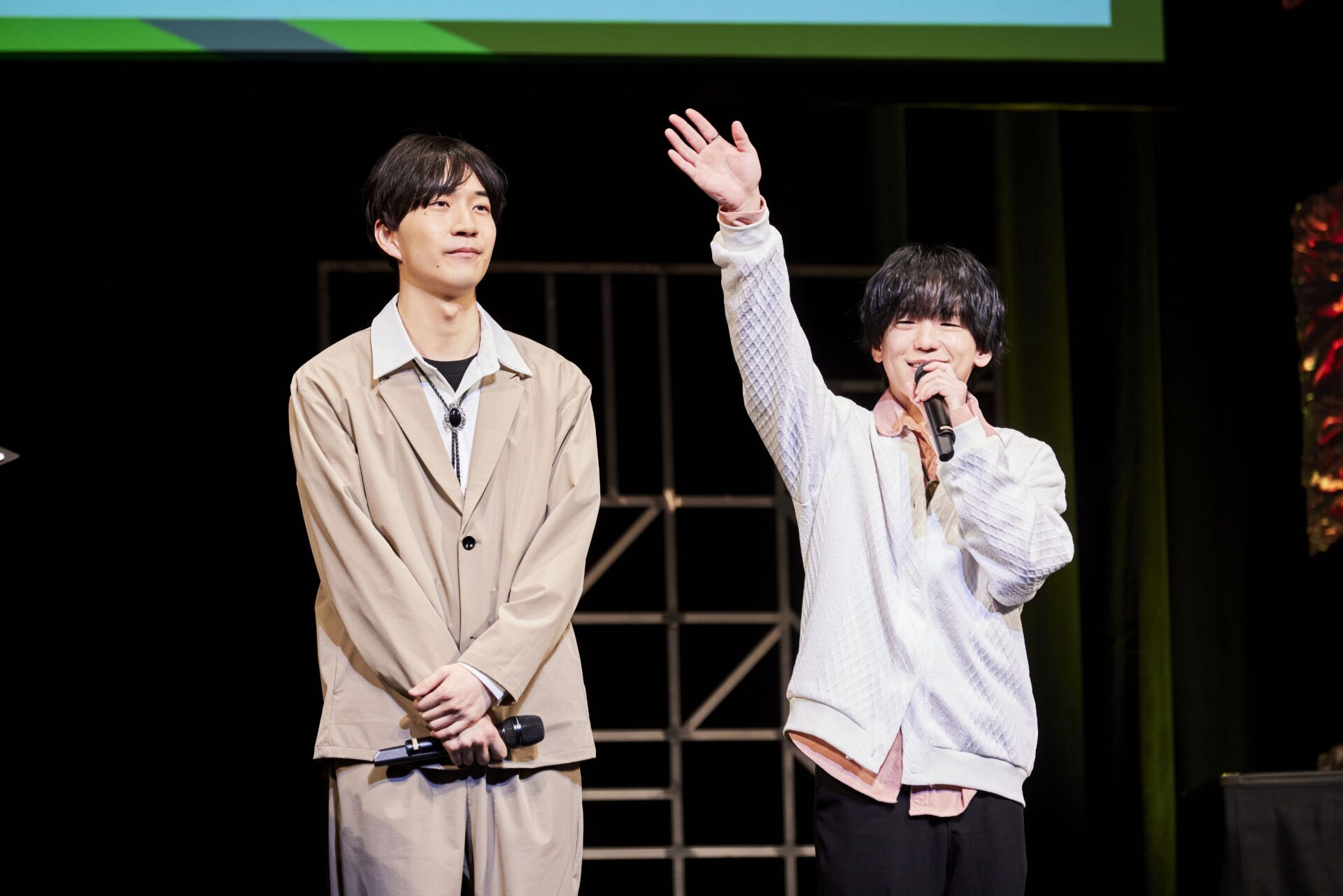 イベントの開始早々に元気よく飛び出してきたのは、MCを務める、長谷川芳明(萬音:須佐優毅 役)と小野寺悠貴(LIGARREN / 東京徒然草:岡村繁樹 役)の二人。小野寺が演じる岡村繁樹は、『LIGARREN』メンバーが住む野々木荘の管理人でもある。