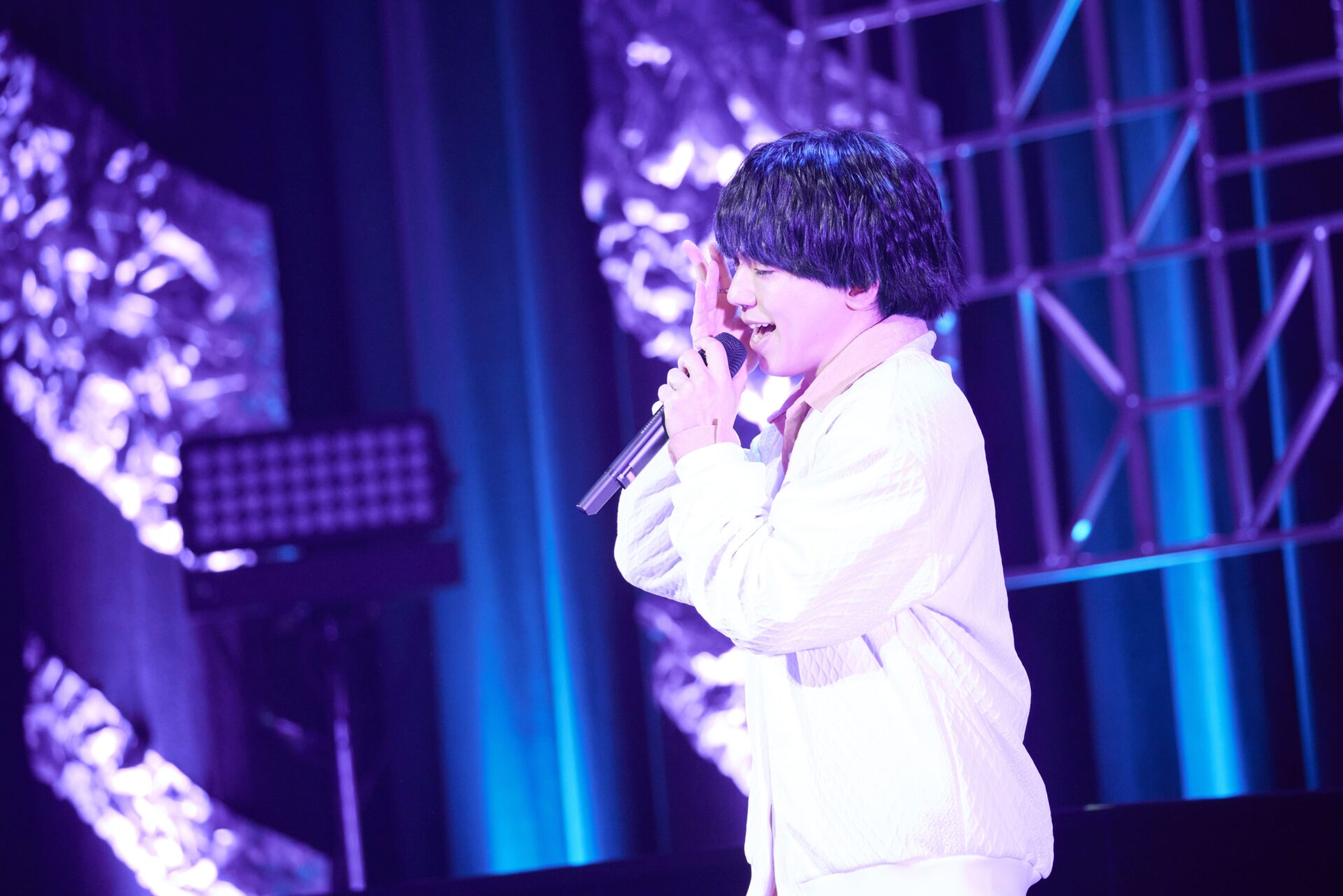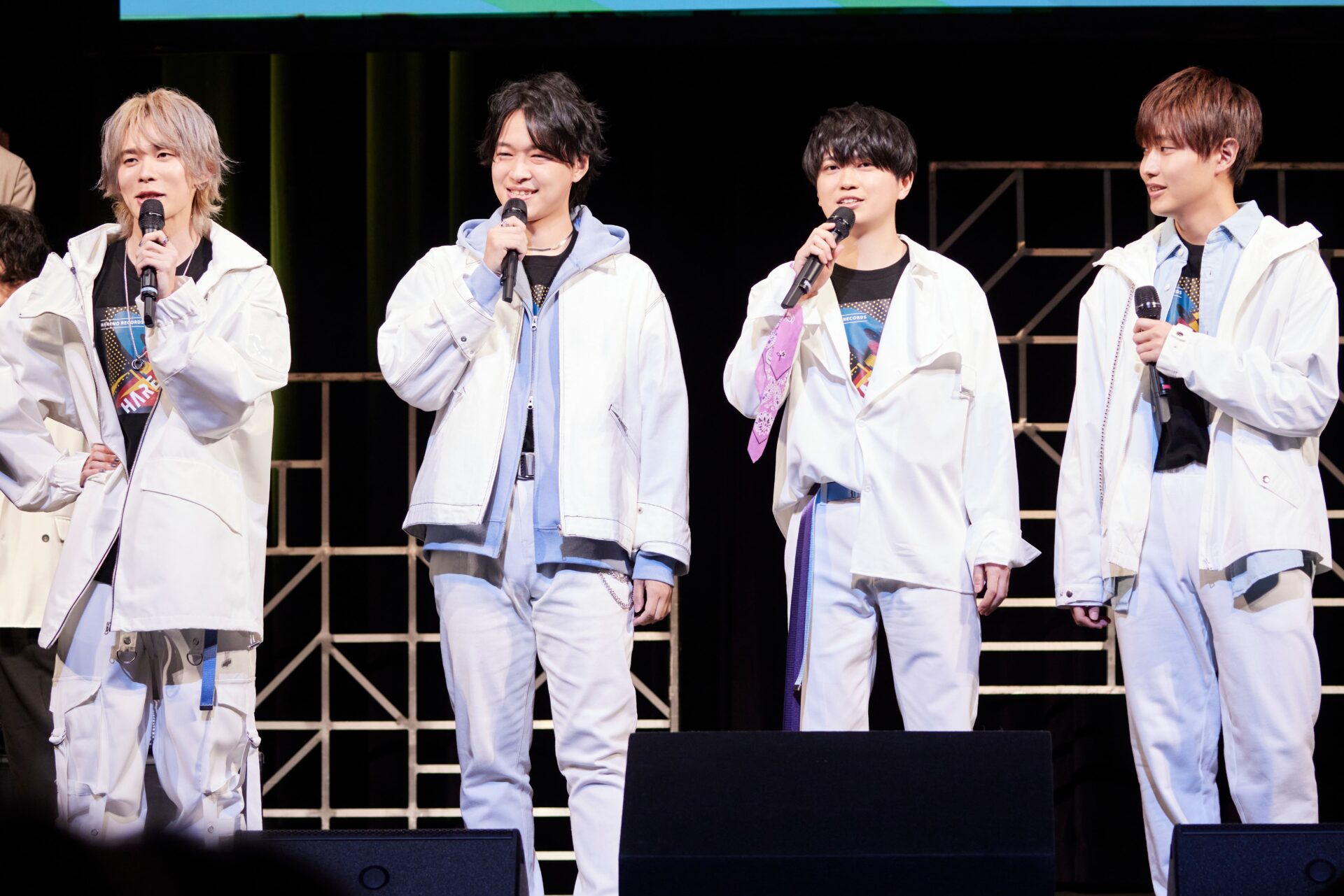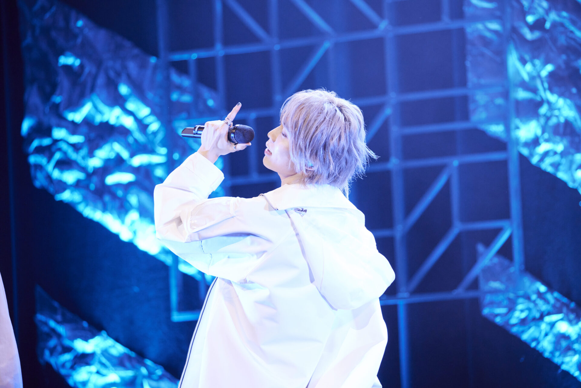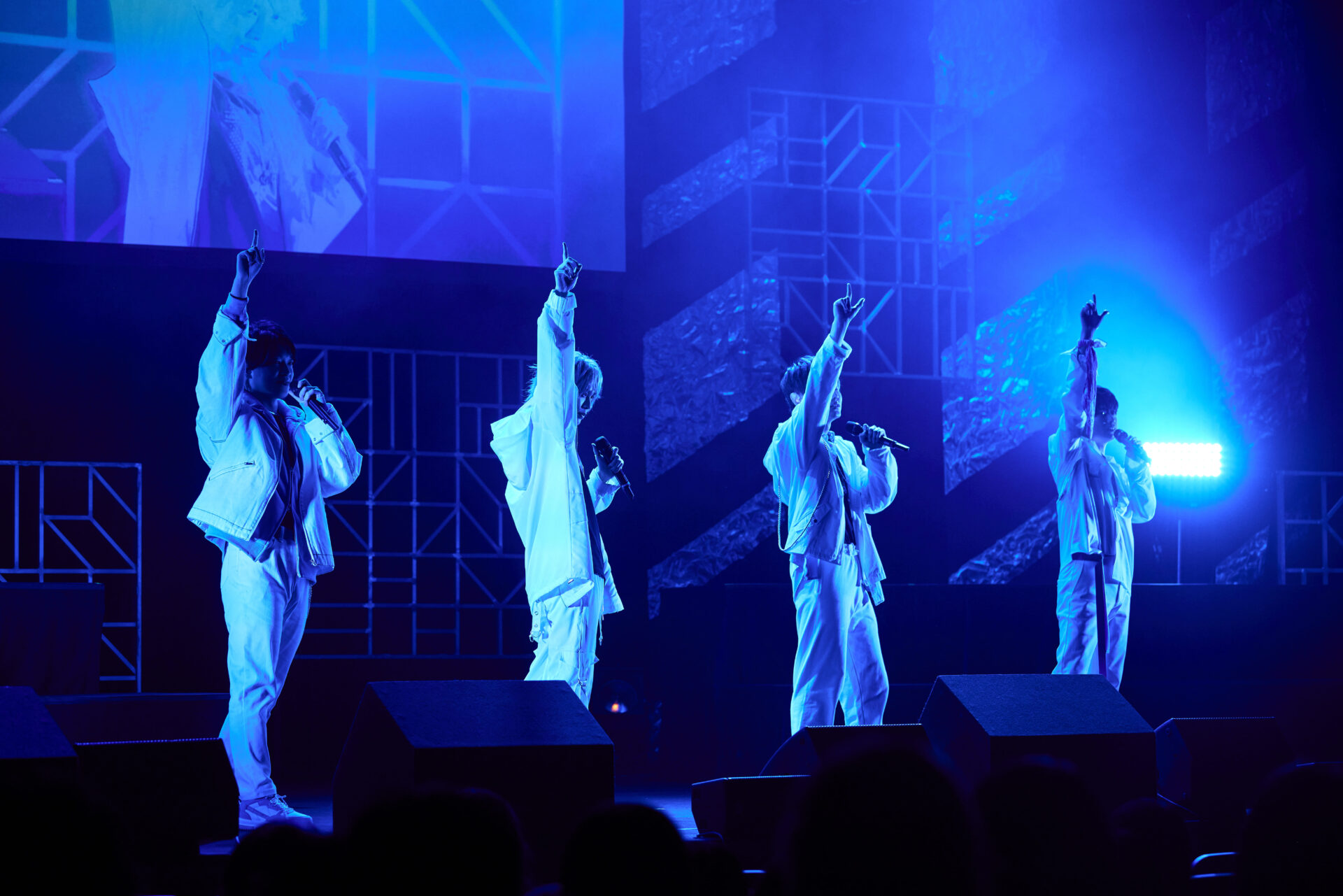 その後に繰り出した『Brand New World』ではドリーミンな歌詞を美声で熱唱。美しいメロディに乗せたリーダー鷹弥(川島)のたのしそうに跳ねるような動きと、芯のある安定した歌声の悠李(閻)は向かい合って歌唱。さらに、洗練された飾らない歌声の理希(浦)と正確な音程で余裕たっぷりに歌い上げるアイル(松岡)の目配せもあり、ユニゾンに展開するとひときわ大きな歓声が上がる。白と水色の揃いのテーマ衣装を着た4人がステージ中央にぎゅっと集まる姿など、終始仲の良さを伺えるパフォーマンスとなった。