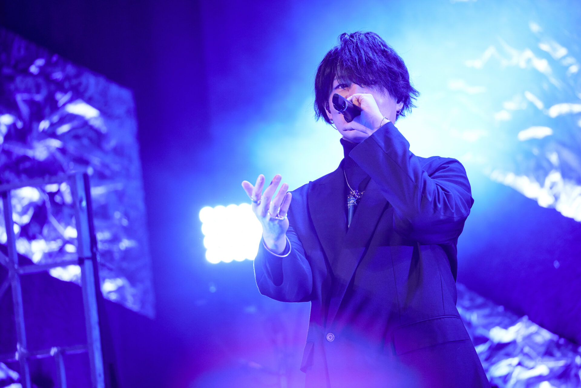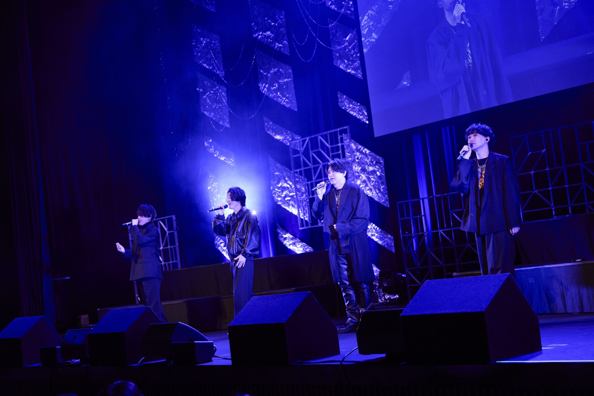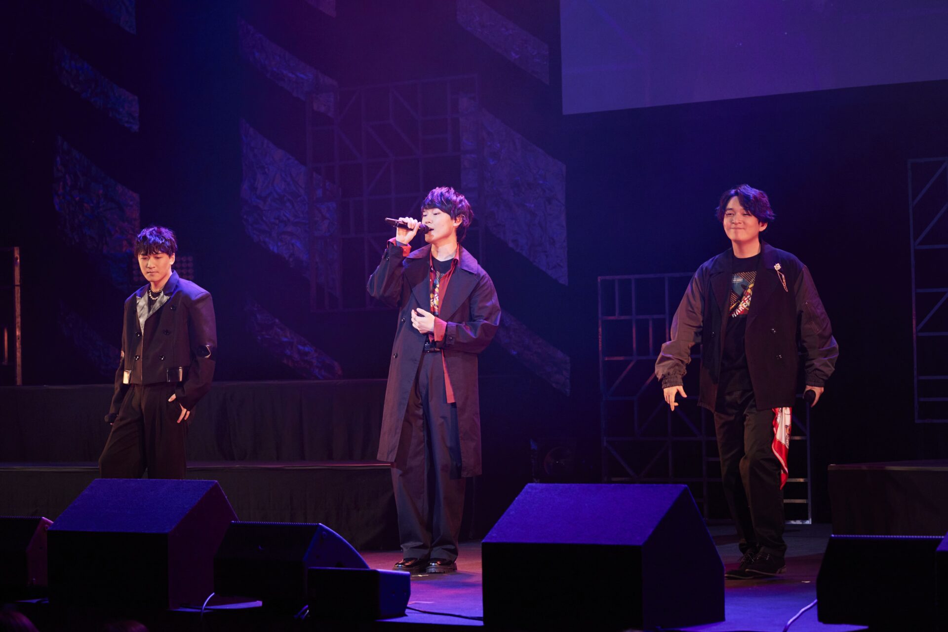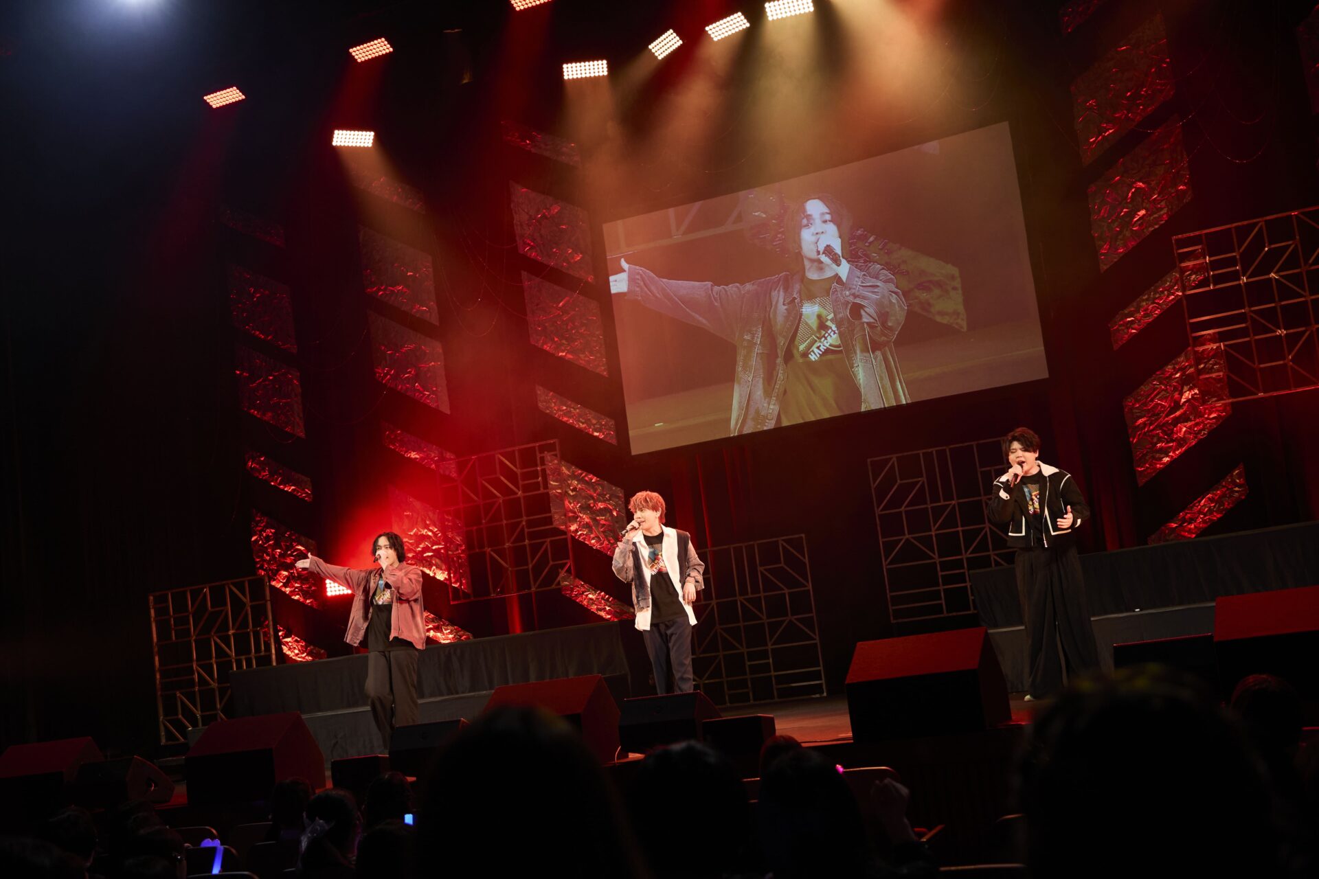 続いて登場したのはLEGAIO。黒と赤の各キャラクターイメージにあった衣装に身を包み、まずはハードなEDM『ADVERSITY』をクラブのようなライティングのもとで披露。崚凱(佐藤)が情熱的に歌い上げる伸びやかな高音から、彩夢(鶴)の凛々しく落ち着いた歌唱、そしていち(梅田)の客席を盛り上げるリズミカルなフットワークとまっすぐな声で息の合ったマイクワークを展開した。