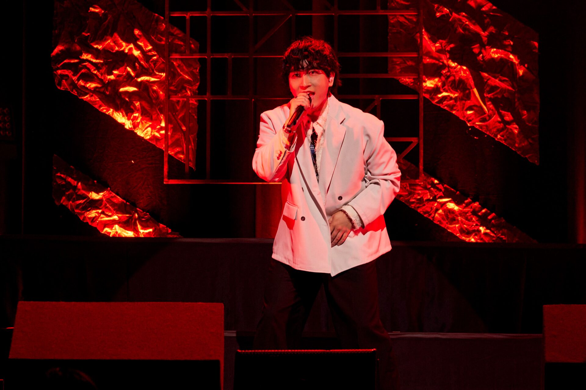 3曲目はNET-LOREから希代明之(中島)のソロ楽曲であるロックナンバー『Break it out』。無音の中、明之(中島)の歌声から始まる幕開け。堂々とした佇まいでステージを支配し、ビートにノッて情熱的に歌いあげる。最後は力強いロングトーンで締めくくり、圧巻のパフォーマンスを見せつけた。