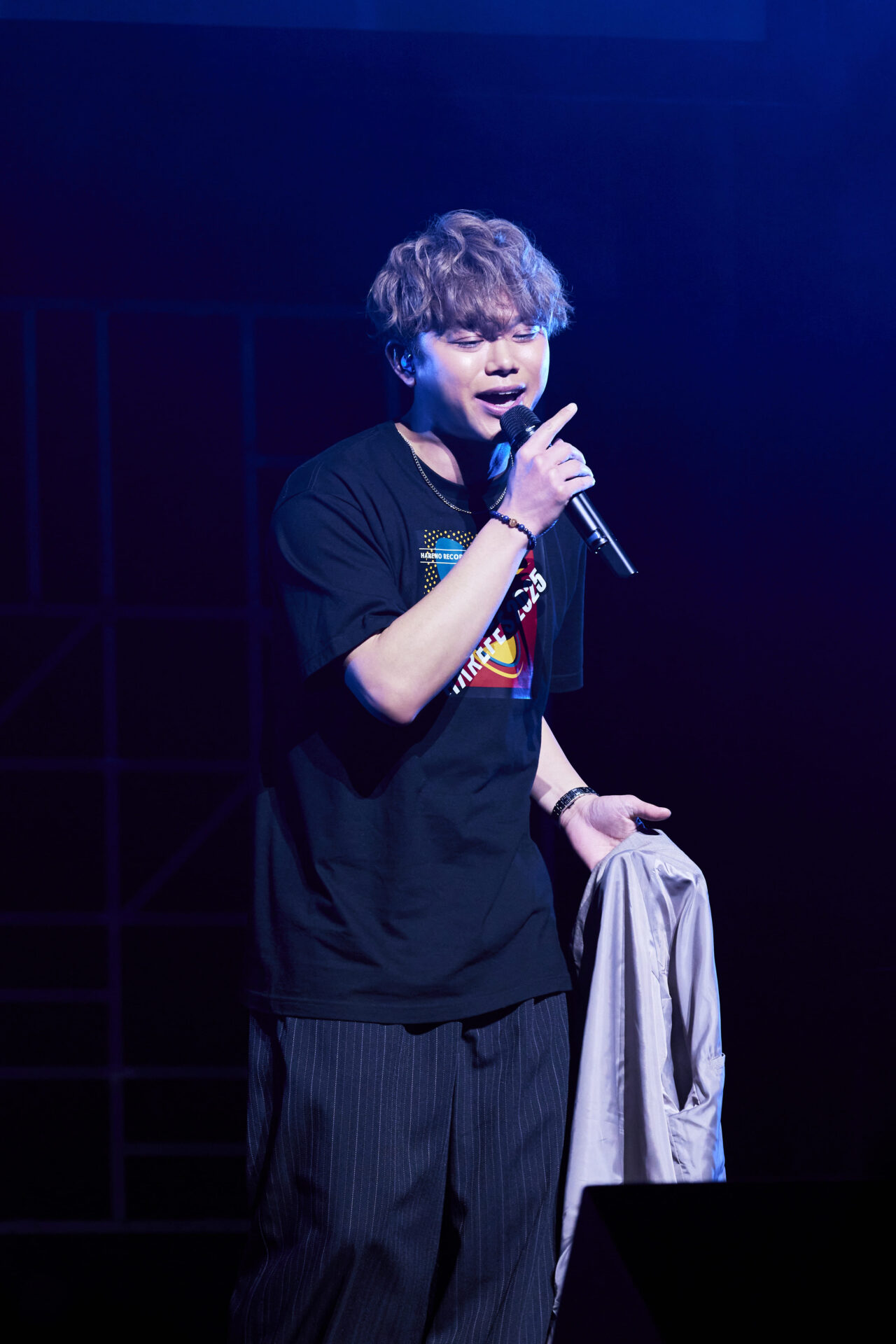 つづいての『六花』は一転してポップなリズムのナンバー。険しさを持った表情から一変、統揮(神尾)が軽やかに歌声を響かせる。続いて雨野雅(粕谷)、思井智考(木暮)がそれぞれのソロで歌いつなぎ、須佐優毅(長谷川)のラップでサビに向けて熱気が高まる。ソウルフルなパフォーマンスで客席を巻き込みながら展開していく、魅力あふれる楽曲だ。