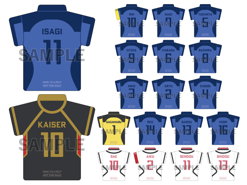 “ブルーロック”イレブンに加え、U-20日本代表の4人、カイザーを含む、全19種のユニフォーム型ステッカーが入場者特典として曜日替わりで配布されます。配布されるステッカーは、東京会場と大阪会場で曜日とラインナップが異なるとのこと。