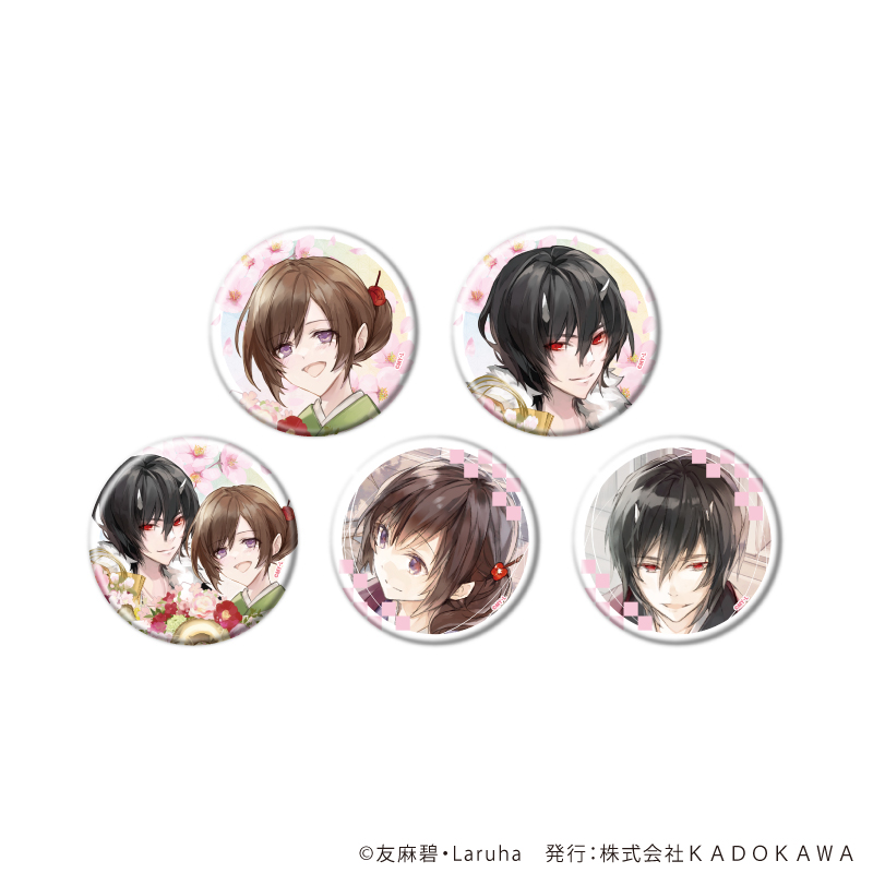 公式イラストを使用した缶バッジ(およそ5.7cm)には、『浅草鬼嫁日記』『おいしいベランダ。』『鬼狩り神社の守り姫』『青薔薇アンティークの小公女』『メイデーア転生物語』『龍に恋う』6作品のデザインが登場。キャラクターのお顔部分をクローズアップしているので、茨木真紀や天酒馨たちの表情をじっくりと眺めることができます!