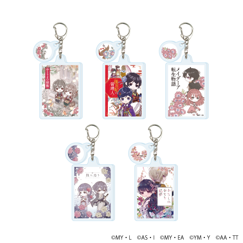パーツ付きアクリルキーホルダーは、大きさおよそ6cm×5cm以内。椿や桜など各作品をイメージした花をあしらったミニパーツで、華やかさがより感じられるように!