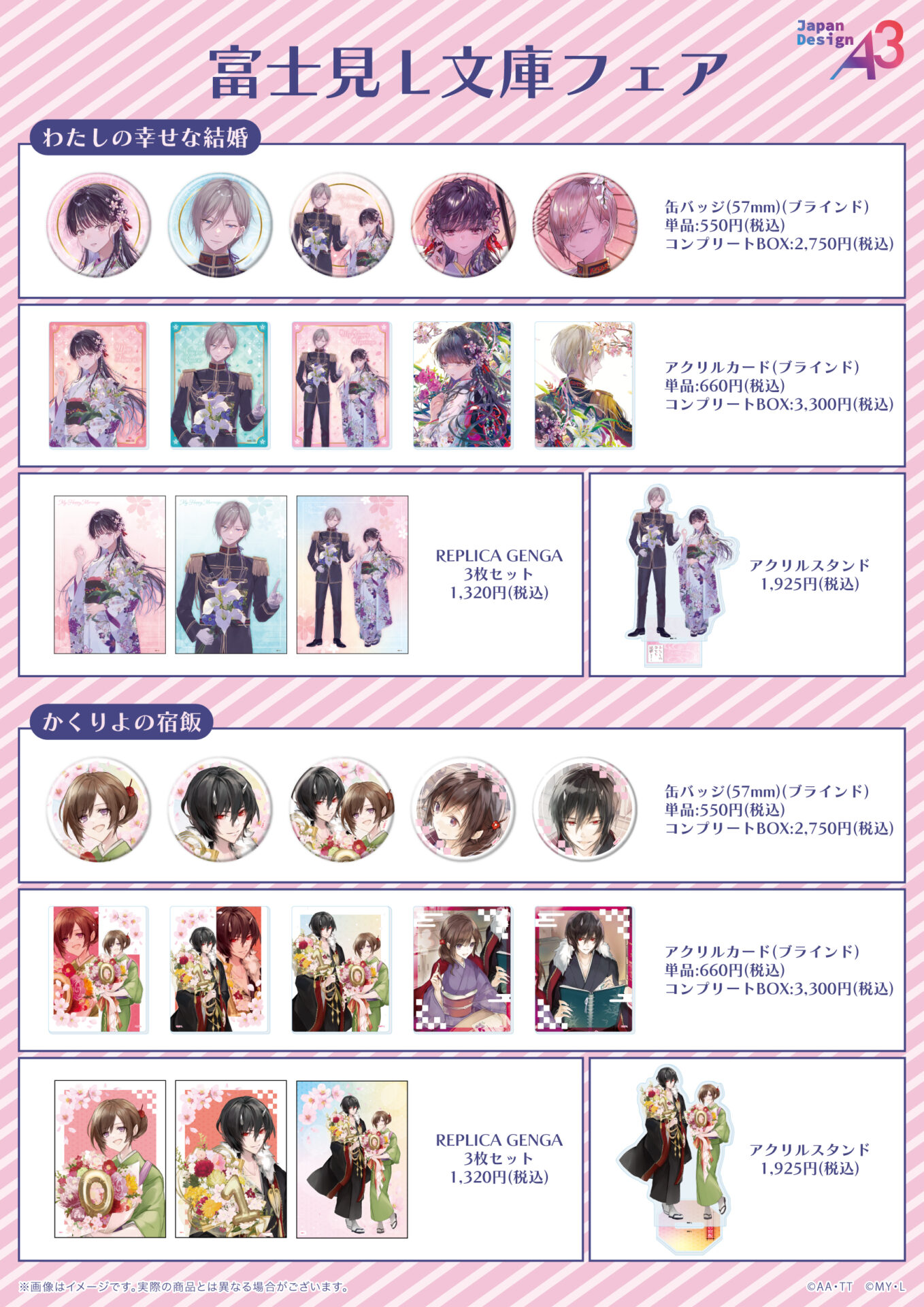 新作グッズは『わたしの幸せな結婚』『かくりよの宿飯』の描き下ろしイラストのほか、公式イラスト、A3オリジナルイラスト・GraffArt(グラフアート)を使用したファン必見のものばかりです。