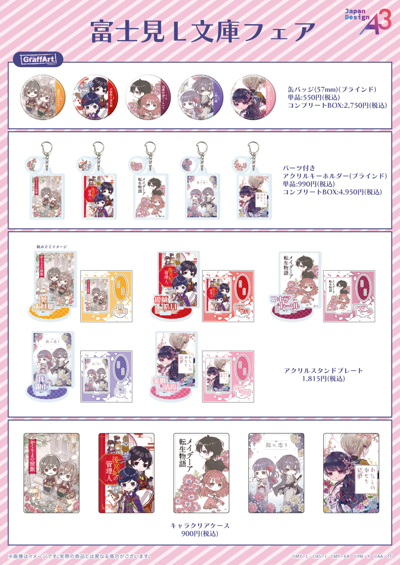らくがき風タッチが特徴のGraffArtを使用したグッズラインナップにも、大きさおよそ5.7cmの缶バッジが登場。『後宮妃の管理人』などの表紙がGraffArtで描かれたデザインを、手のひらの上でぜひご堪能ください!