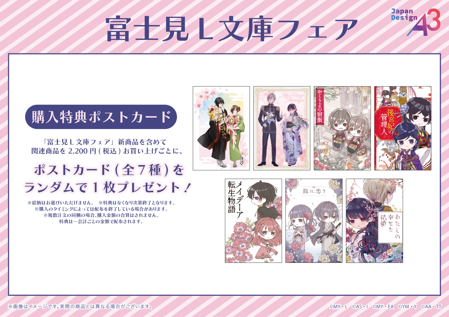 今回登場した「富士見L文庫フェア」の新作グッズを含む関連商品を2,200円(税込)お買い上げごとに、ポストカード(全7種)をランダムで1枚プレゼントします。