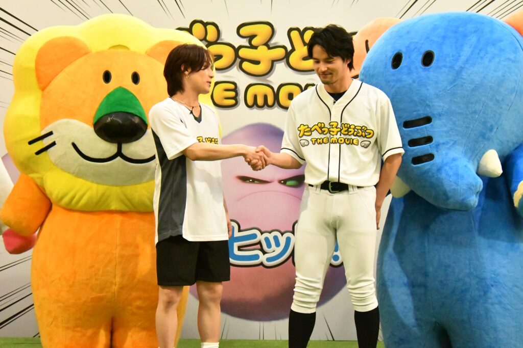 松田・らいおんくんペア、⽔上・ぞうくんペアがそれぞれチームワークをもって、キックベースとベースボールにチャレンジ。最凶わたあめ軍団があしらわれた特大ヒットボードにボールが当たればヒット=映画も特大ヒット! というシンプルなルールで挑む。手足の短いらいおんくんやぞうくんにはヒットを繰り出すのはぺがさすちゃん救出作戦よりもハードルが高そうなミッションだが、松田は「らいおんくんとしても声を入れさせてもらって、らいおんくんはぞうくんにいつも頼っていたので、松田的にも、リアル世界でも頼っているので、助け合いながら成功できたらいいなと思います」と特大ヒットへの意気込みをコメント。さらに水上も「ボールを当てられたら映画がヒットするってことですもんね。まずは今日のミッションを、助け合いながら頑張ります!」と、松田から差し出された手をとり、固い握手を交わした。