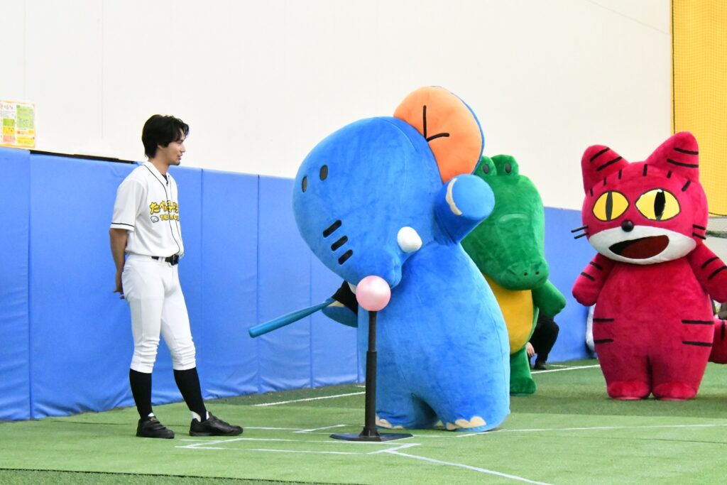 まずは、水上・ぞうくんペアのベースボールチャレンジ。 「ボードにボールが当たれば、映画が“当たる”んですね!?」と再び確認する水上が、バットを握るぞうくんを「もうちょと前に」「この辺りをバットで狙って」とサポート。らいおんくんら9人のたべっ子どうぶつたちと並び応援する松田からは 「頑張れー! シンプルに頑張ってもらって、ヒットを狙いましょう!」とエールが贈られた。