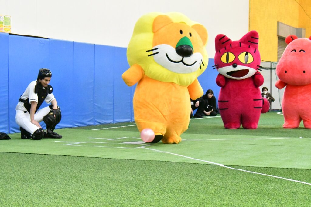 そんな良い流れを受け、続いて松田・らいおんくんペアがキックベースにチャレンジ。らいおんくんにボールを出すピッチャーとして松田が位置につくと、らいおんくんがそのボールを蹴って「大ヒット」を撃ち抜くため、バッターボックスに立つ…。