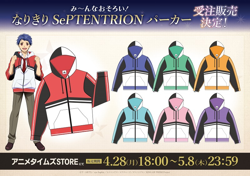 6月27日(金)からの劇場公開を記念して、「み~んなおそろい!なりきりSePTENTRIONパーカー」のアニメタイムズSTOREでの受注販売が決定しました。同商品は、先日公開されたキャラクターソロビジュアルで、主人公の一条シンらSePTENTRIONの7名が着用しているパーカーを再現したもの。