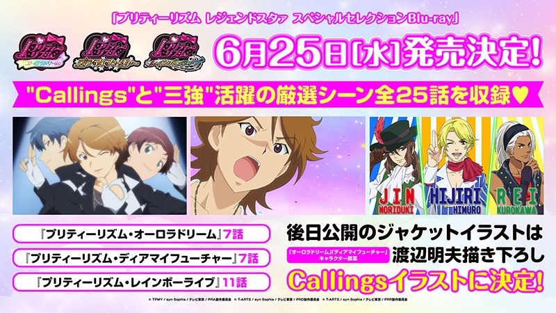 劇場アニメ『キンツア』にも登場するCallingsのショウ・ヒビキ・ワタル、”三強”の法月仁・氷室聖・黒川冷。彼らの活躍を一気に振り返ることができる、「プリティーリズム レジェンドスタァ スペシャルセレクションBlu-ray」が2025年6月25日(水)に発売されることが決定しました。