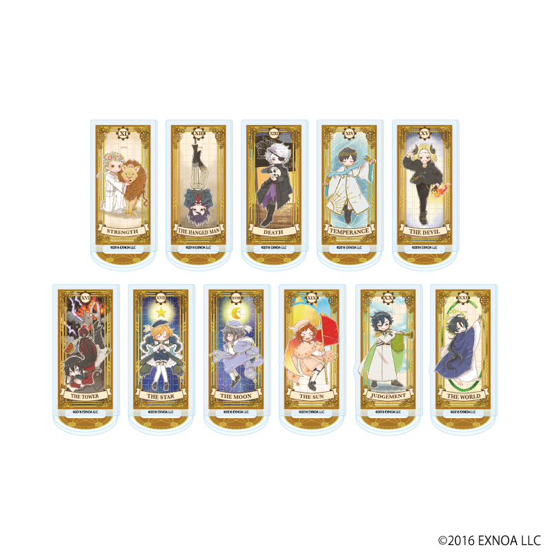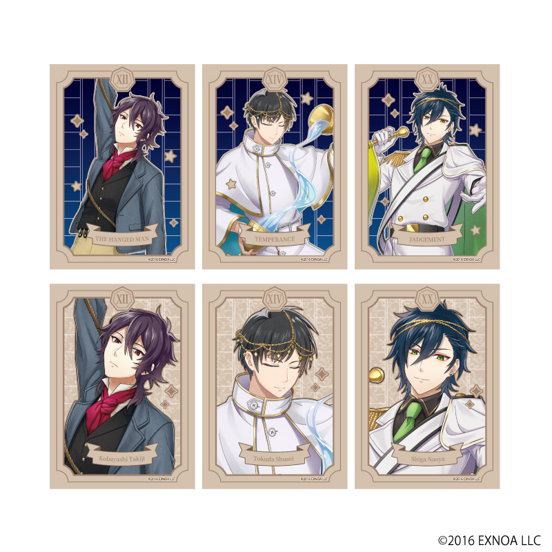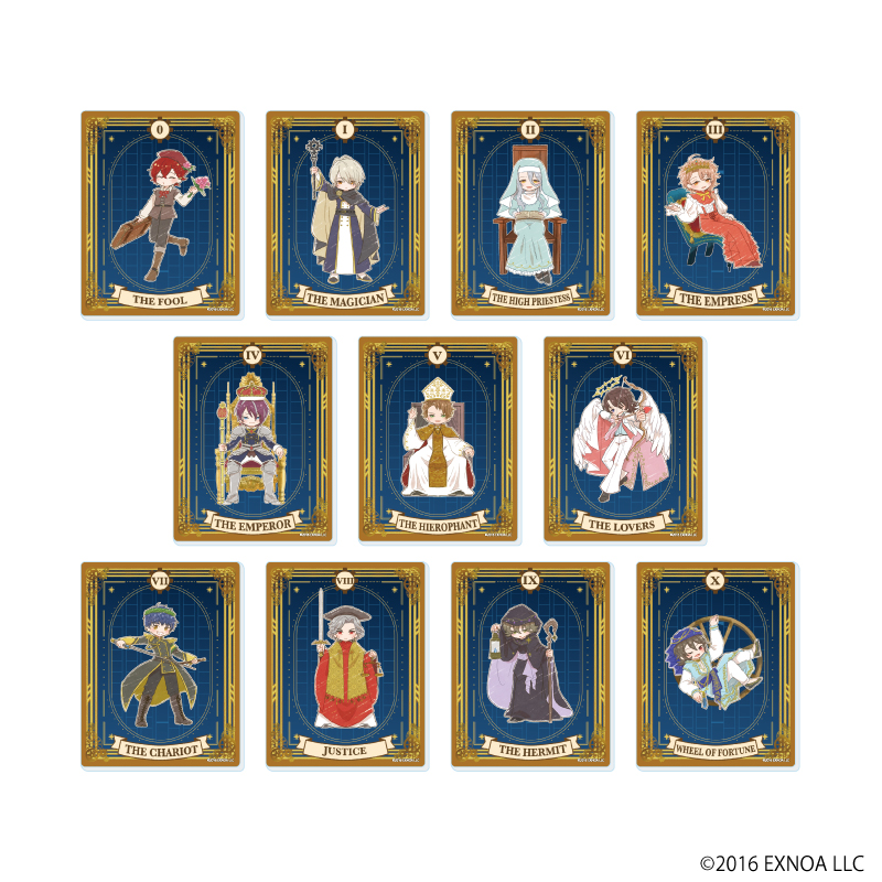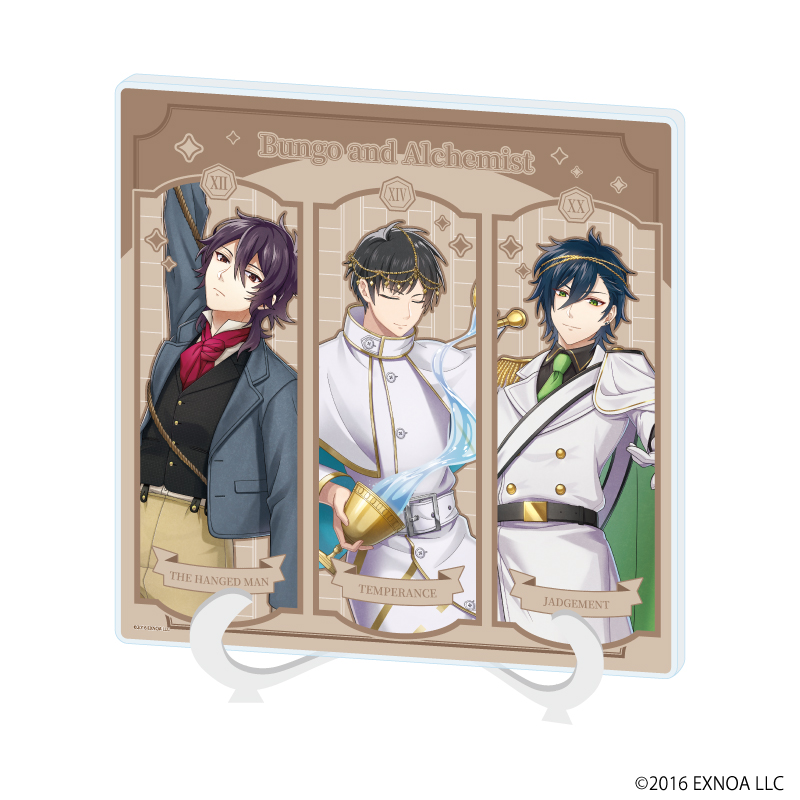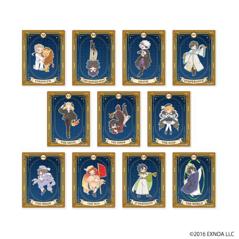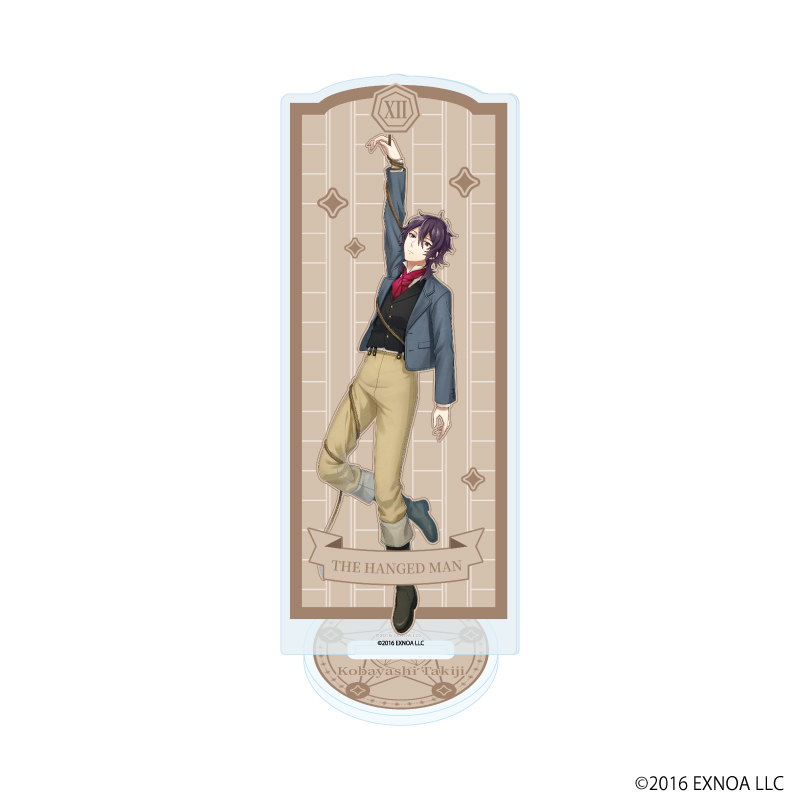 縦横最大15cmのアクリルスタンドは、本物のタロットカードをイメージしたデザイン。小林多喜二の「吊るされた男」、徳田秋声の「節制」など、ミステリアスな文豪たちの等身描き下ろしイラストをたっぷりとご堪能ください!