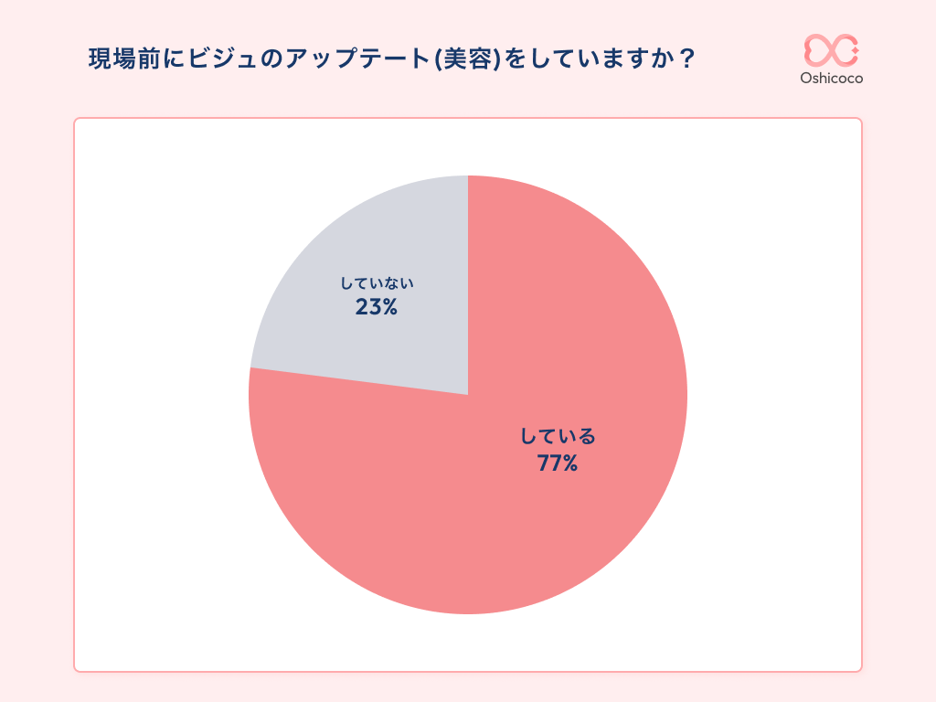 まず「現場前に美容活動をしているのかどうか」のアンケートの結果、「美容活動をしている」と答えた人は8割近くにのぼり、推し活層の現場に対する美容意識が非常に高いことが分かりました。