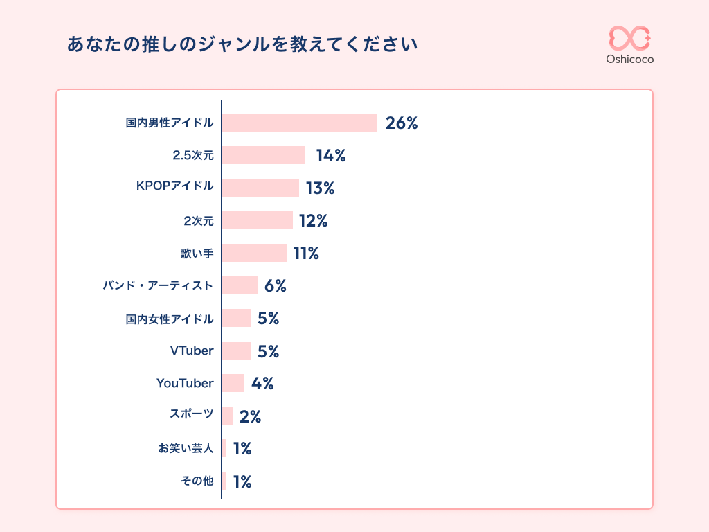 回答者の中で高い割合を占めた推しジャンルは「国内男性アイドル」、次に「2.5次元」、そして「KPOPアイドル」と続きました。推しとの直接的な接触機会を楽しむという意味合いでは、実際に本人に会える”3次元”の人気が高い状況となっているようです。