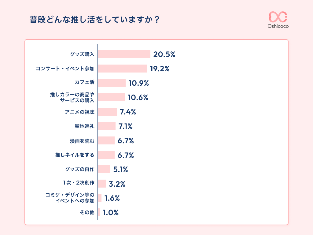 「普段どんな推し活をしているのか」についての調査の結果、一番多かったのが「グッズ購入」、次に「コンサート・イベント参加」「カフェ活」と続きました。