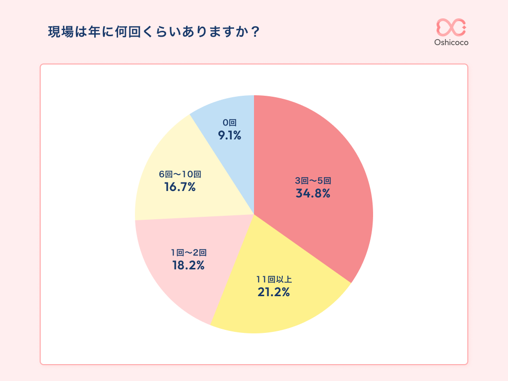 続いては1年間の現場の回数についての調査結果です。年に6回以上現場がある推し活層の割合は約38%、つまり3人に1人以上が、2か月に1回程度の頻度でライブやコンサートに参加していることが分かります。