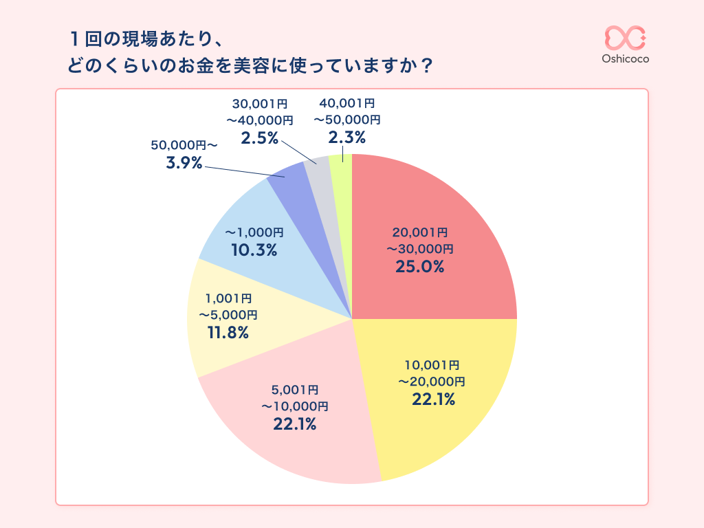 続いては、美容活動にかかる金額についてのアンケート結果です。1回の現場あたりに使うお金が「10,001円~30,000円」の割合は全体のほぼ半数となり、2人に1人は1回の現場で1~3万円程度使うという結果に!