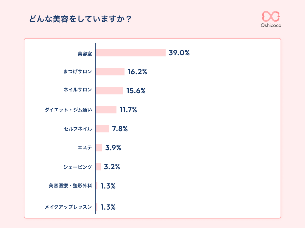 利用金額の具体的な内訳に関して、圧倒的な割合だったのが「美容院」の39%で、2.5人に1人は現場前に美容院に行っていることが分かりました。次に「まつげサロン」16.2%、「ネイルサロン」15.6%と続く結果に。