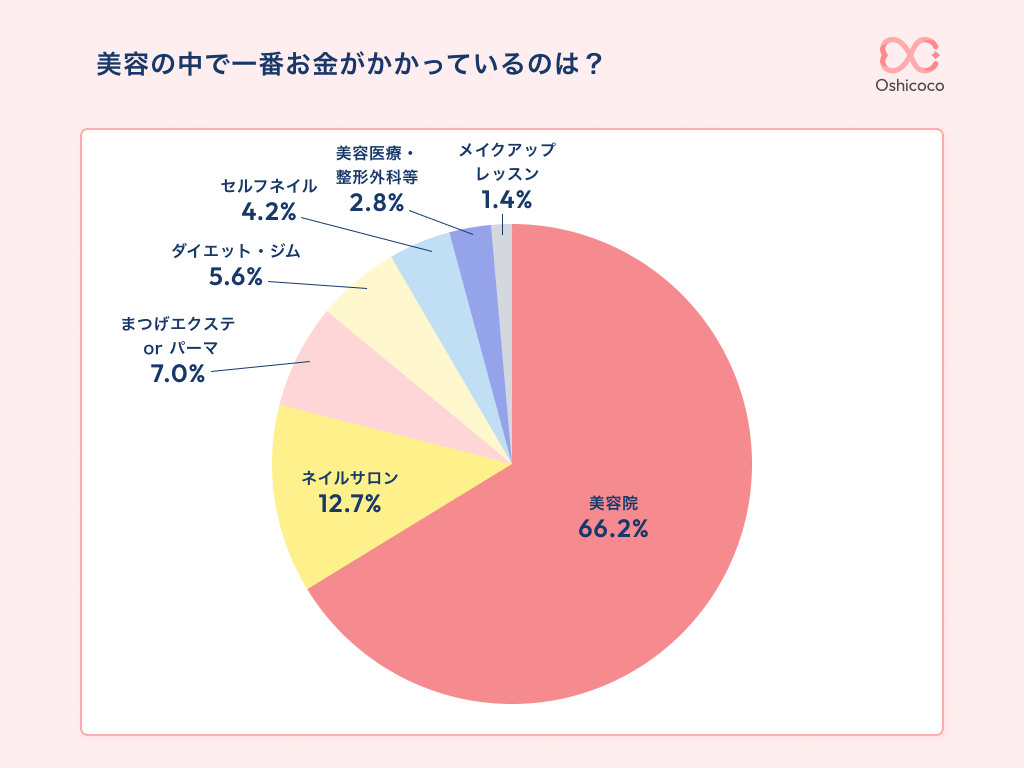 次にお金をかけている美容活動についての調査結果です。ここでも「美容院」が66.2%と大きな割合を占めました。次に「ネイルサロン」が12.7%、「まつエク・マツパ」が7.0%と続きます。