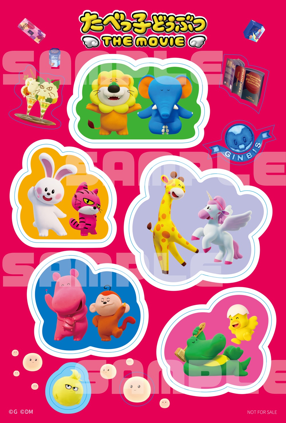 「たべっ子どうぶつ」メンバーはもちろん、らいおんくんにくっ付いて離れなくなるわたあめ“ゴッチャン”、作中登場の“にんじんパフェ”、“またたびパフェ”、さらには、「たべっ子どうぶつ」を長年発売してきたギンビス社のロゴまでステッカーに。