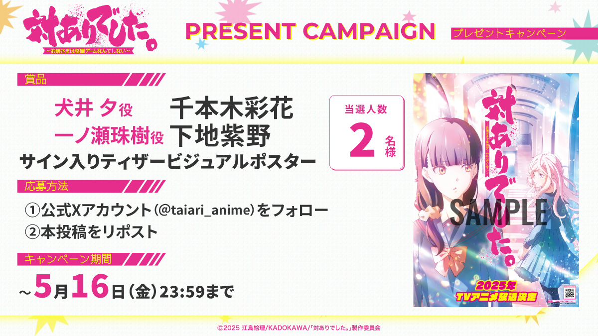 アニメ公式Xをフォロー&該当の投稿をリポストした方を対象に、犬井 夕役の千本木彩花さん、一ノ瀬珠樹役の下地紫野さんのサイン入りティザービジュアルポスターが当たるとのことなので、キャンペーンにもぜひ参加してみましょう!
