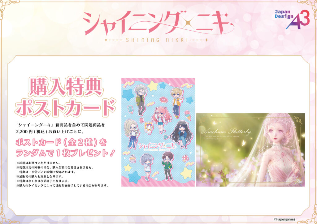 『シャイニングニキ』新商品を含めて関連商品を2,200円(税込)お買い上げごとに、特典ポストカード(全2種)をランダムで1枚プレゼント!