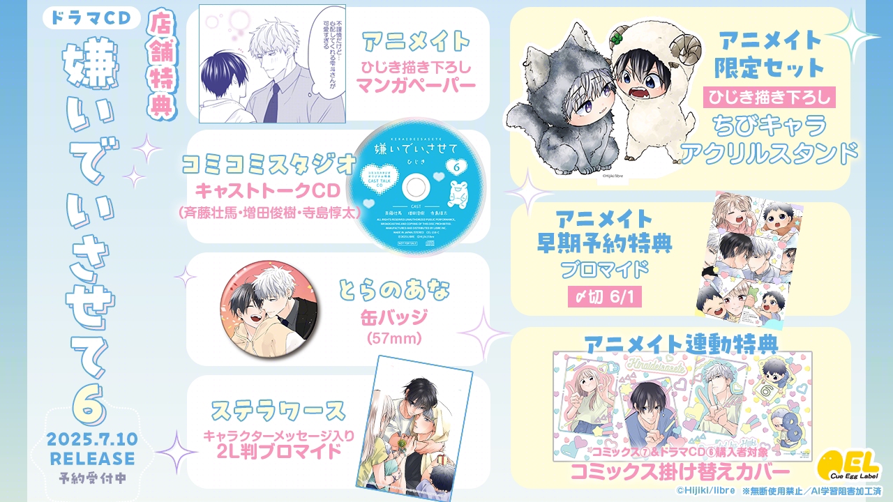 『嫌いでいさせて』のコミックス7巻とドラマCD6巻が、2025年7月10日に同日発売されることが決定。アニメイトでは、連動購入キャンペーンも開催中です。連動特典「コミックス掛け替えカバー」がもらえるチャンスを、どうぞお見逃しなく!