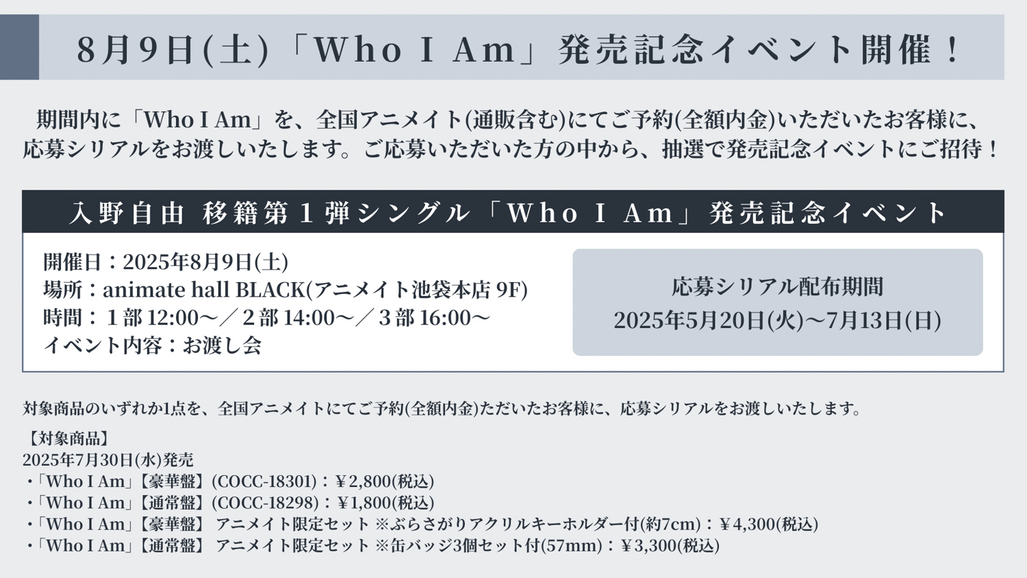 5月20日(火)~7月13日(日)の期間内に、「Who I Am」を全国アニメイト(通販含む)にてご予約(全額内金)いただいた方に、応募シリアルを配布。応募者の中から、抽選で発売記念イベントに招待されます!